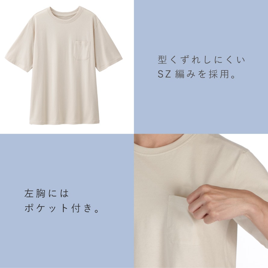 さらに、型くずれしにくいSZ編みを採用。糸の撚りを工夫することで、洗濯を重ねても形が崩れにくく、きれいなシルエットを保ちやすいのが特長です。毎日のように着るTシャツだからこそ、扱いやすさにもこだわりました。