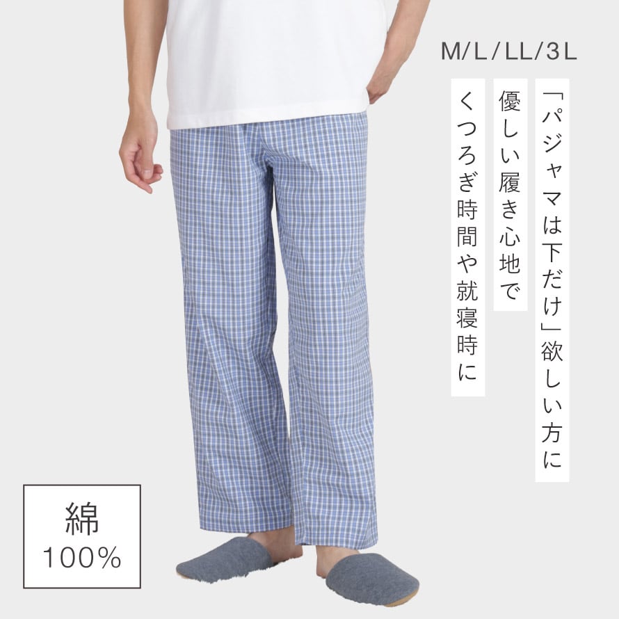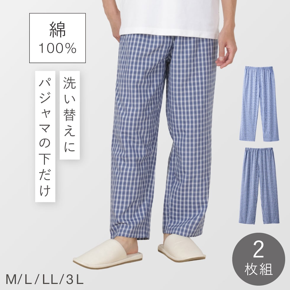 パジャマ ズボン メンズ 綿100% 下だけ 2色組 夏用 チェック柄 総ゴム ポケット付き ウエストゴム取替口付き 前開きなし M L LL 3L ゆったり 大きいサイズ 綿100%メンズ下だけパジャマ 紳士用 男性用 50代 60代 70代