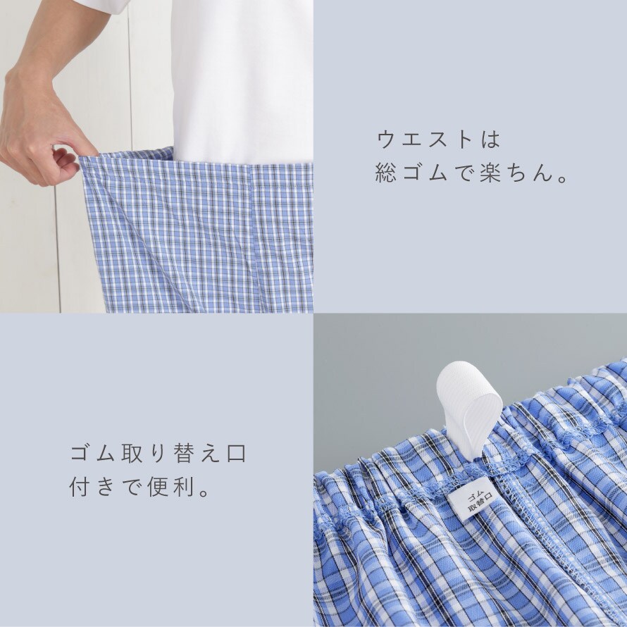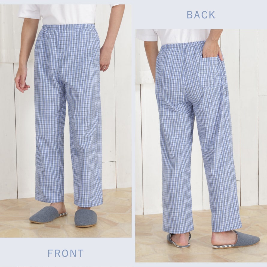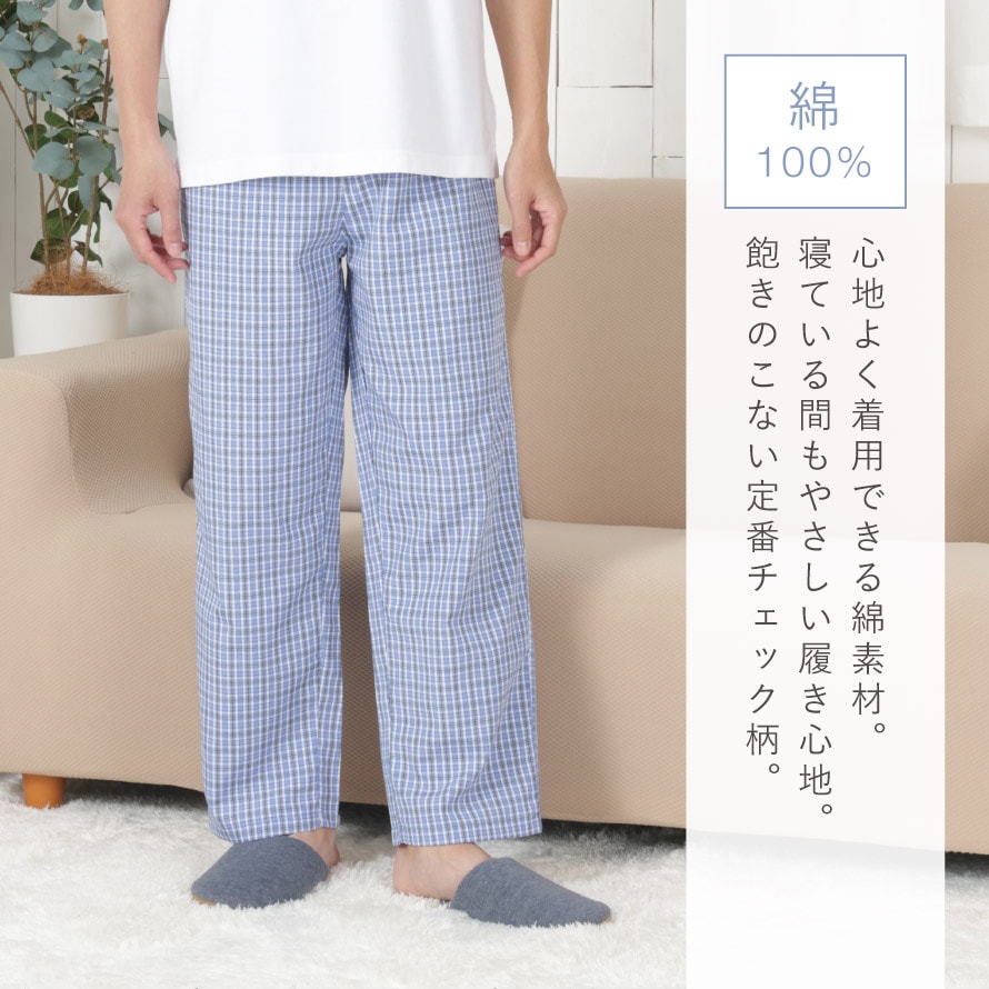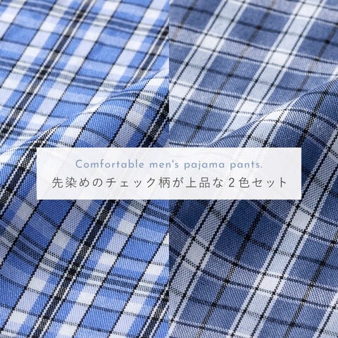 素材は綿100%を使用し、やわらかな肌ざわりで心地よく着用できます。寝ている間もやさしいはき心地で、毎日のくつろぎ時間や就寝時にぴったりです。先染めのチェック柄が上品で、飽きのこない定番デザインに仕上げました。