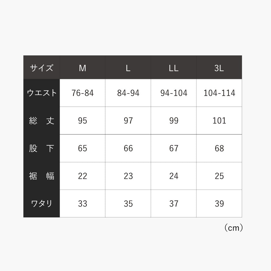 | サイズ | M/ウエスト76-84、総丈95、股下65、裾幅22、ワタリ33、L/ウエスト84-94、総丈97、股下66、裾幅23、ワタリ35、LL/ウエスト94-104、総丈99、股下67、裾幅24、ワタリ37、3L/ウエスト104-114、総丈101、股下68、裾幅25、ワタリ39cm |