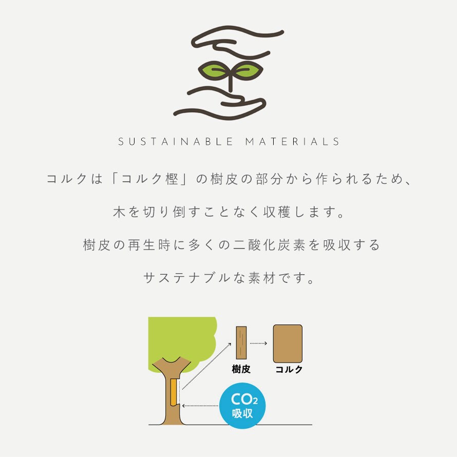 コルクは「コルク樫」の樹皮の部分から作られるため、木を切り倒すことなく収穫します。樹皮の再生時に多くの二酸化炭素を吸収するサステナブルな素材。