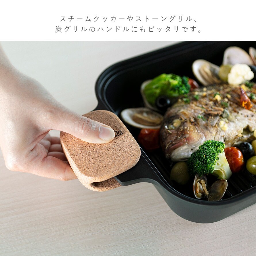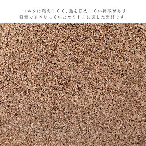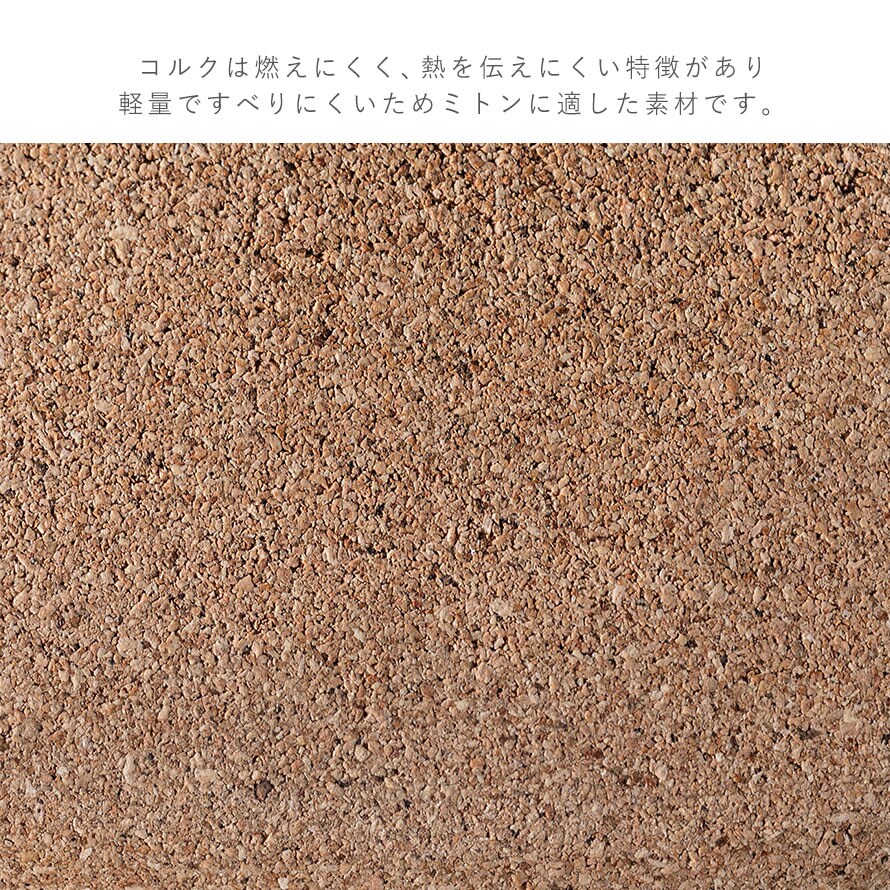 コルクは燃えにくく、熱を伝えにくい特徴があり軽量ですべりにくいためミトンに適した素材です。