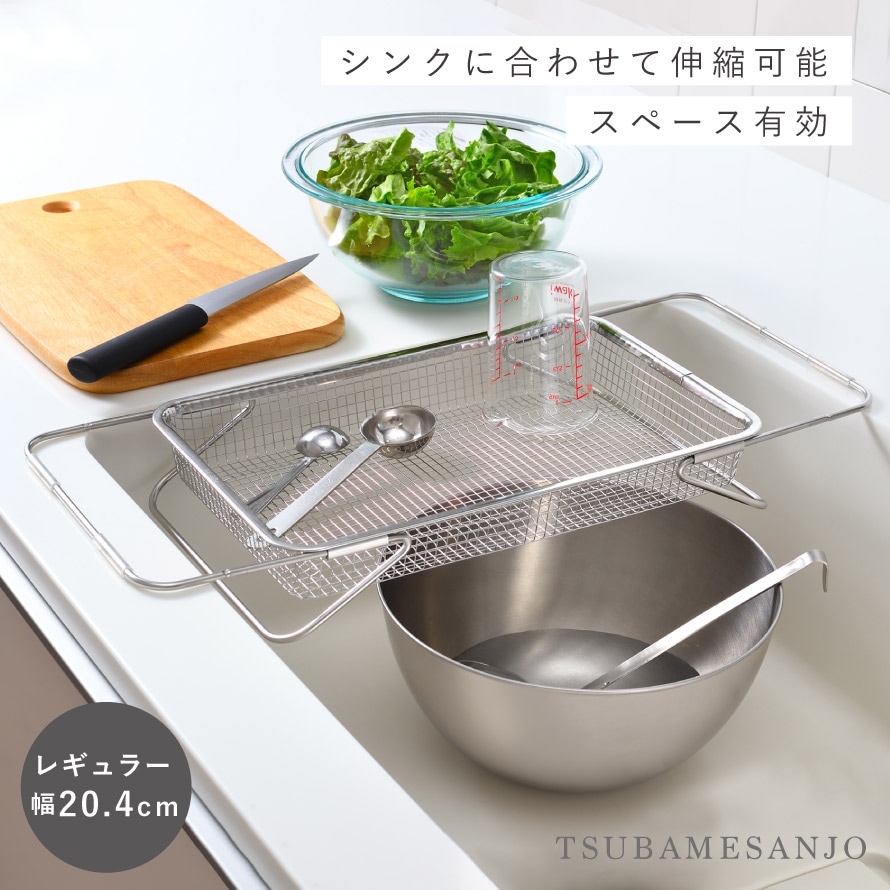 燕三条 水切りラック ステンレス 20cm 水切りかご 伸縮 シンク上・シンク中対応 自立スタンド付き 日本製 コンパクト 水切りメッシュかご レギュラー 水筒パーツ