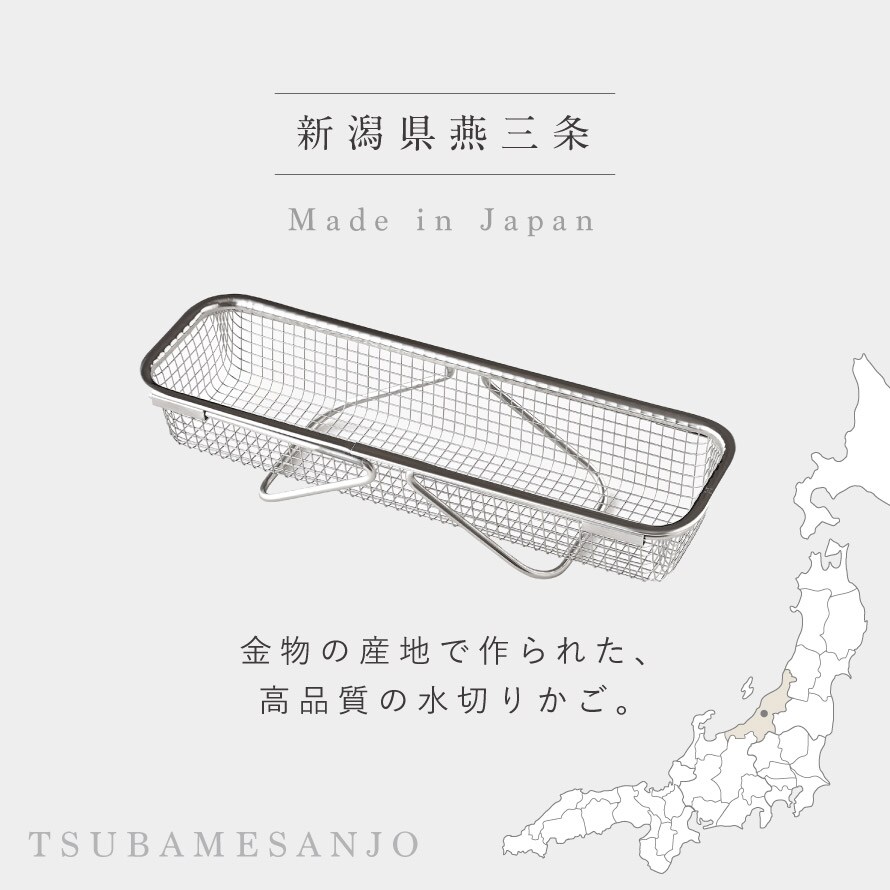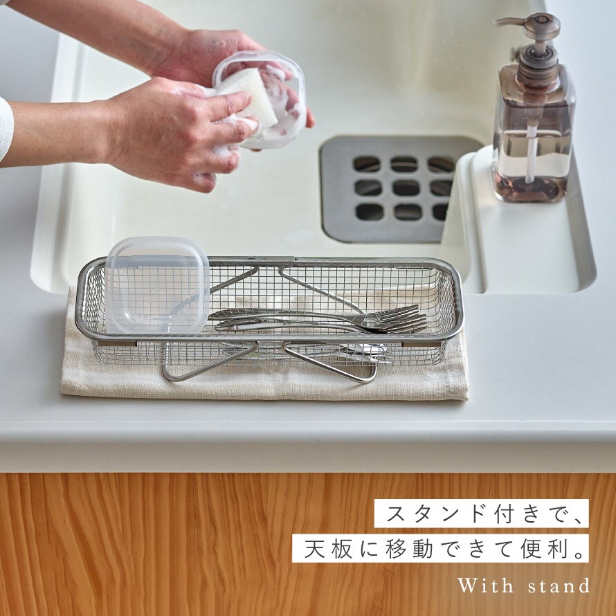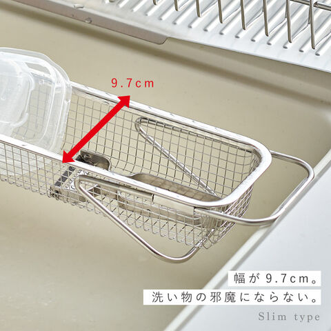 燕三条 水切りラック ステンレス スリム 9.7cm 水切りかご 伸縮 シンク上・シンク中対応 自立スタンド付き 日本製 コンパクト 水切りメッシュかご スリム 水筒パーツ