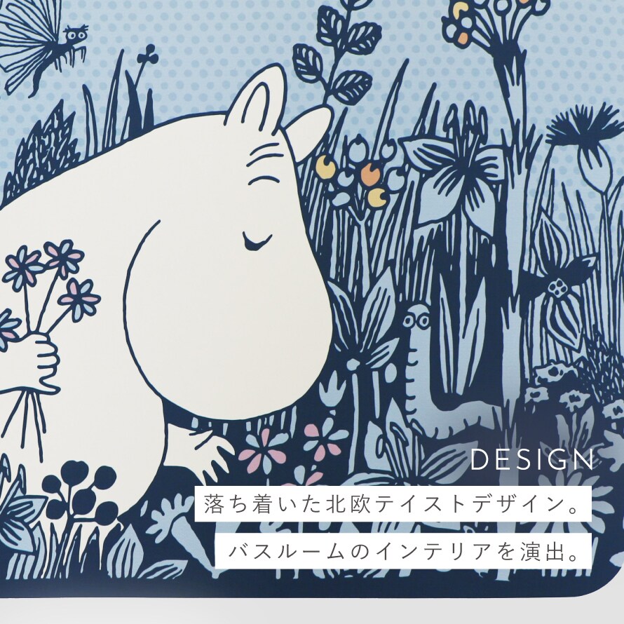 ガーデニング中のムーミン谷の仲間たちが微笑ましい。ソフトタイプで使いやすい珪藻土入りバスマット。