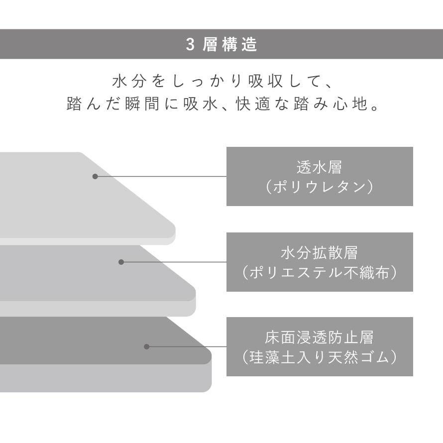 吸水性と速乾性のある珪藻土パウダー入りの機能性マット。水分をしっかり吸収する3層構造なので、踏んだ瞬間に吸水し、最後にお風呂に入られる方までいつでも快適な踏み心地です。