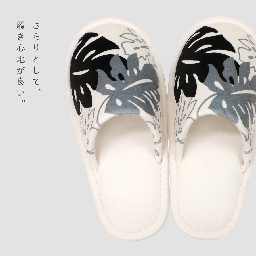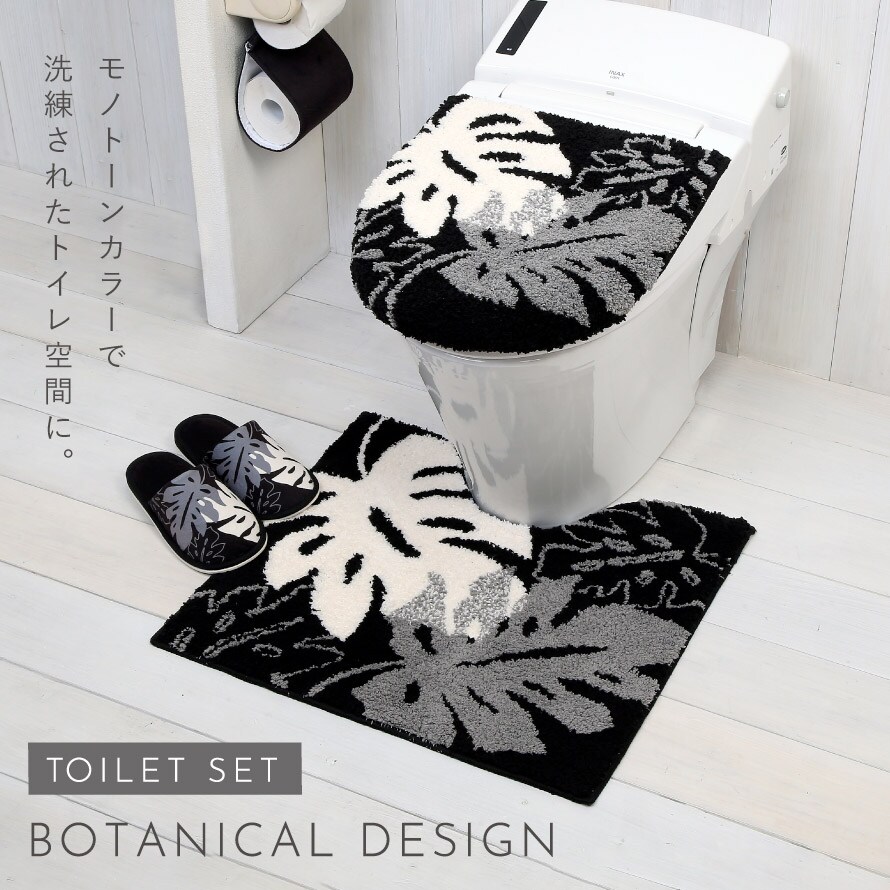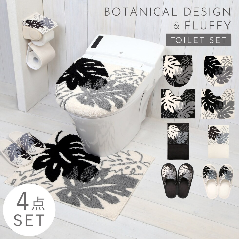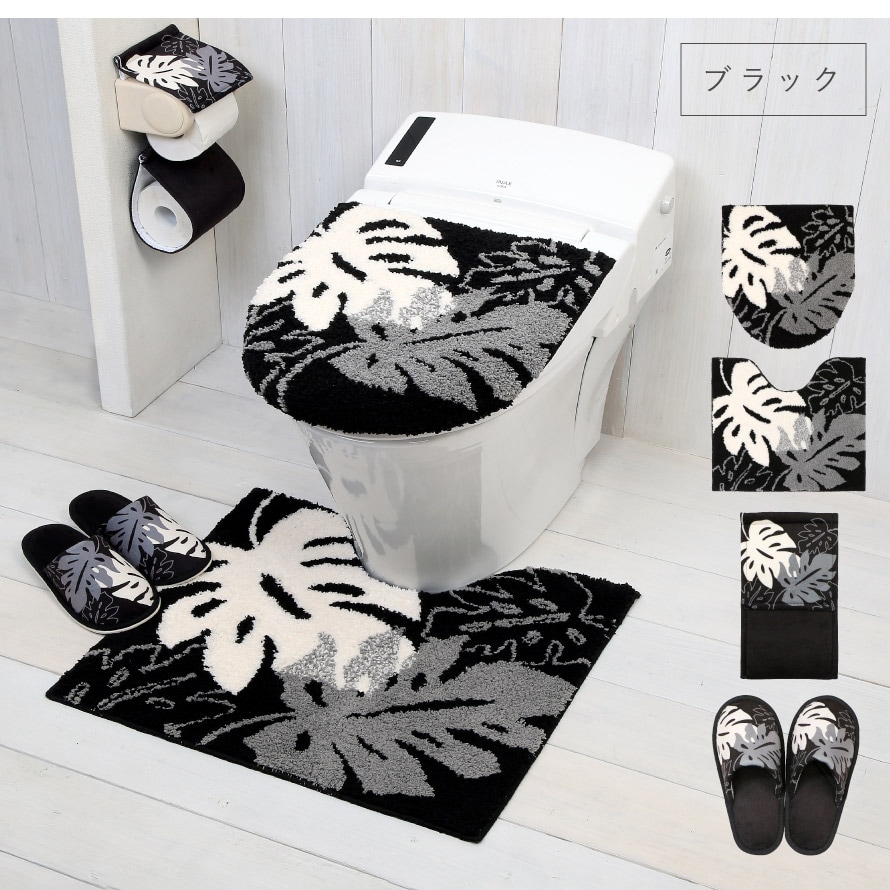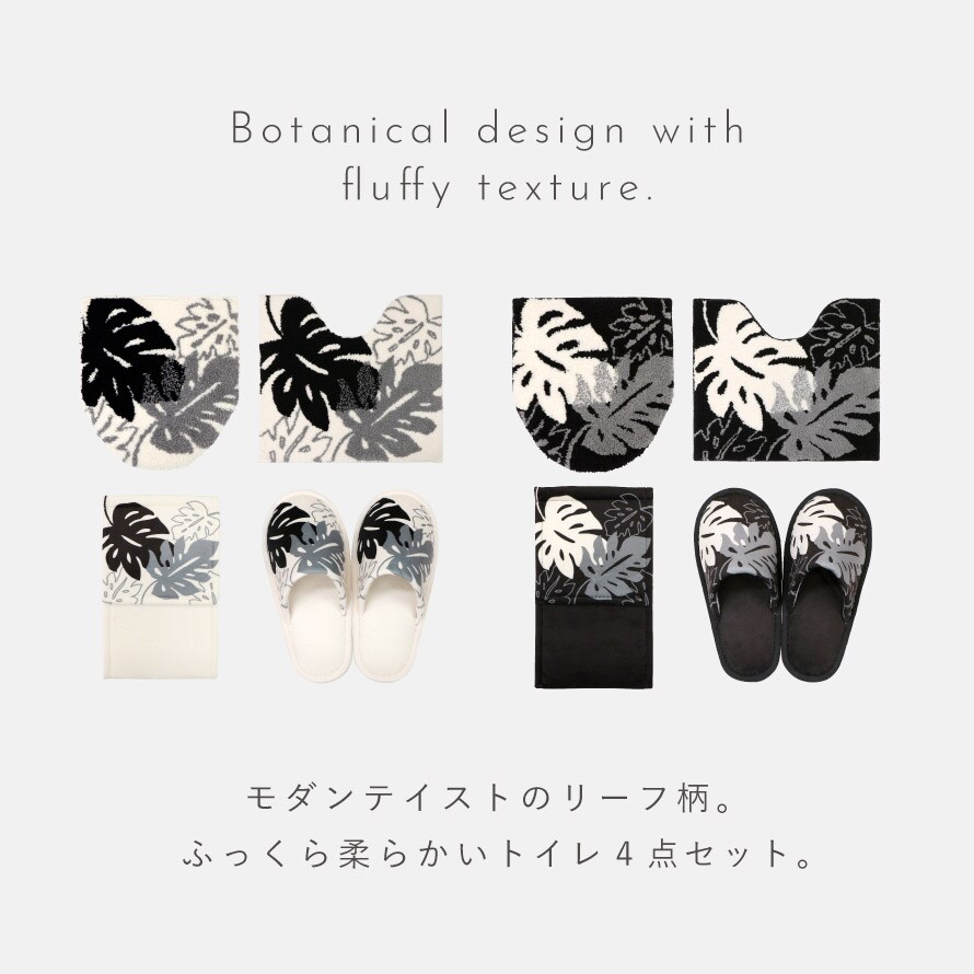 モノクロ&植物柄が落ち着いた印象。極上のふかふかさのトイレマット&兼用フタカバー&スリッパ&ペーパーホルダーカバーの4セットです。