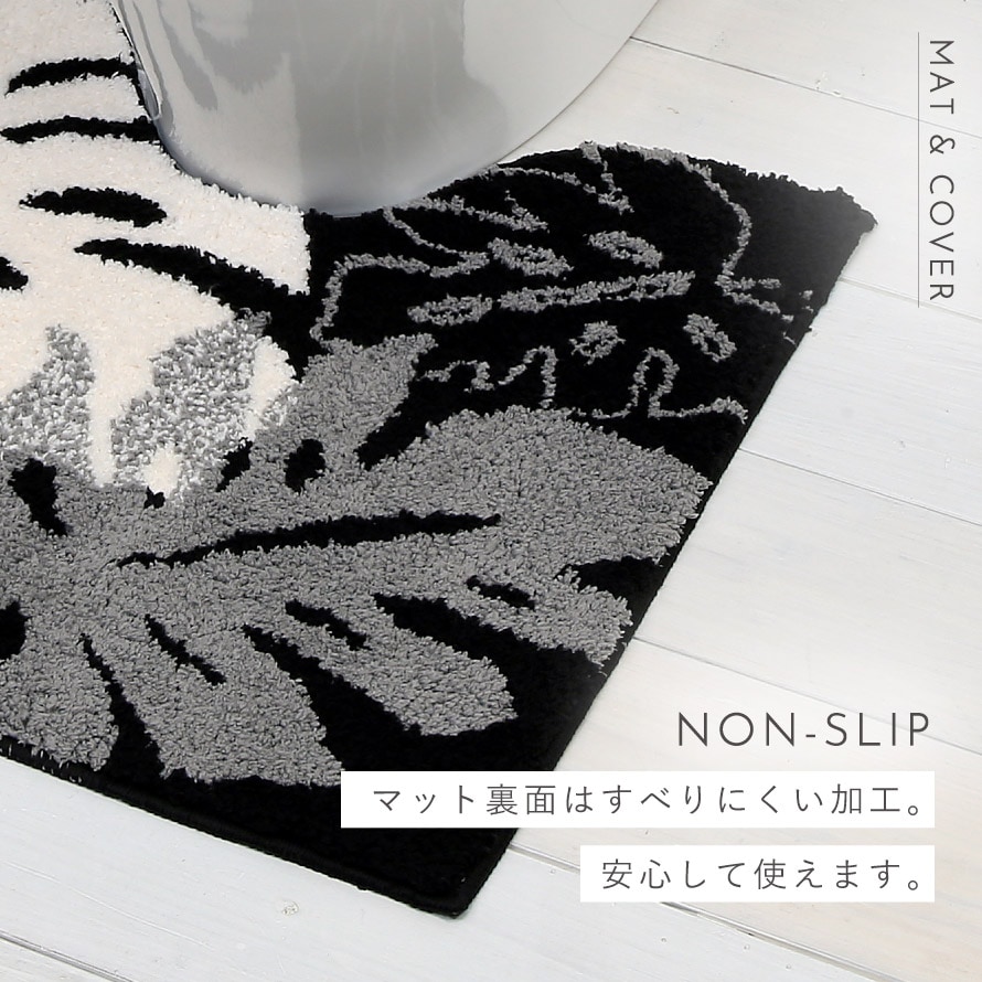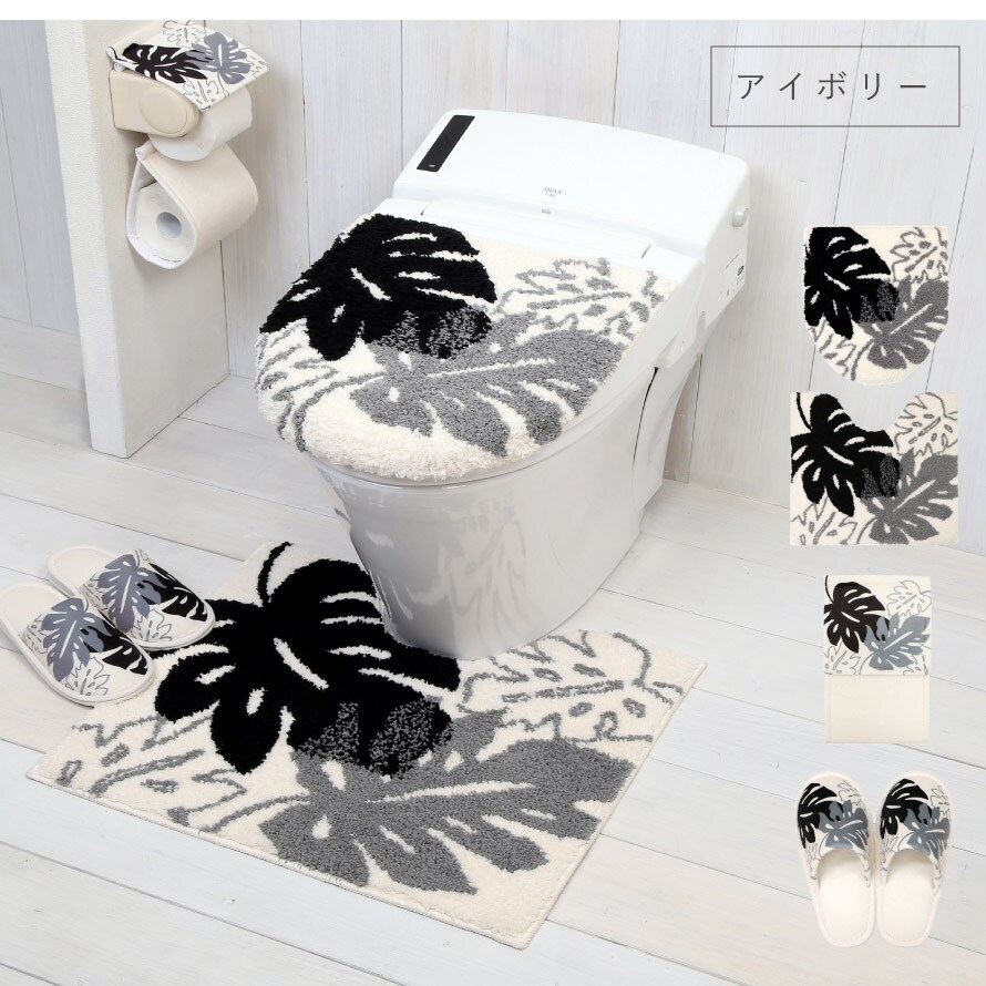 トイレマット モノトーン ふかふか トイレ フタカバー セット 4点 洗える モンステラ 柄 ブラック 黒 アイボリー 北欧 おしゃれ モノ・ステラ マット・フタカバー・ペーパーホルダー・スリッパ 4点セット