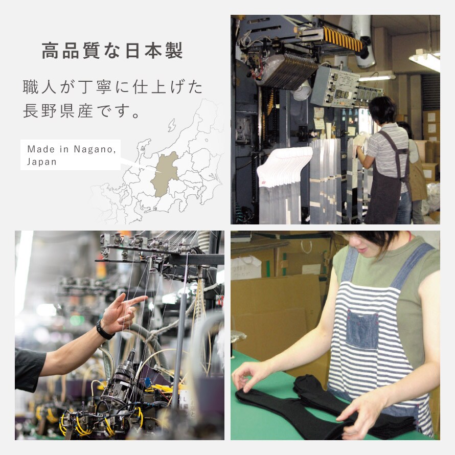 肌側に毛混糸、外側に丈夫で毛玉になりにくい綿混糸、中心には伸縮性のあるポリウレタン糸を使用した3重編み。薄くてもあったかポカポカ。