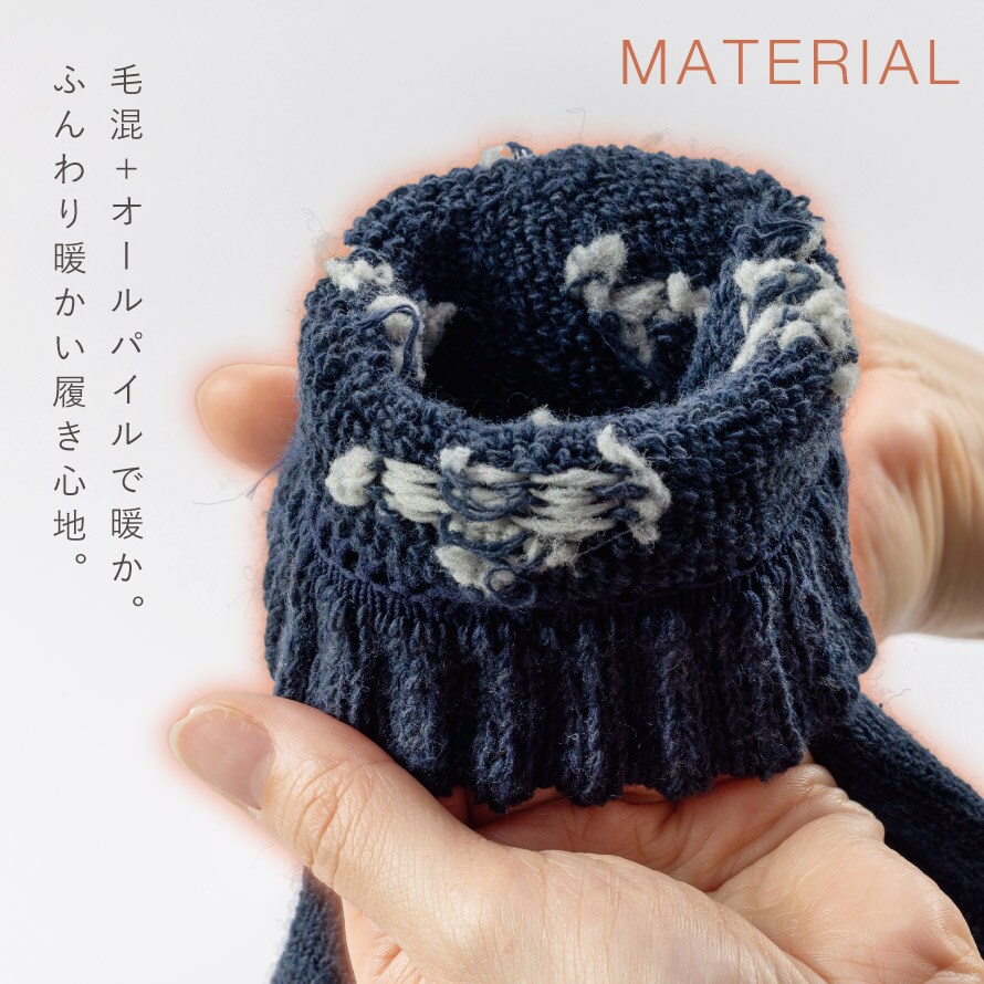 まるでセーターのような素材。オールパイルでふんわり足を包み込む、暖かな毛混のソックス。