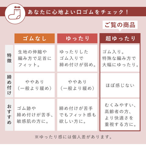 履き口部(口ゴム)が約30cm伸びる超ゆったり設計。足首ゆったりのタイプの靴下の中でも、かなりゆったりしたタイプになります。足首をしめつけず、むくみが気になる方にもおすすめです。