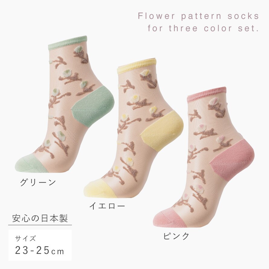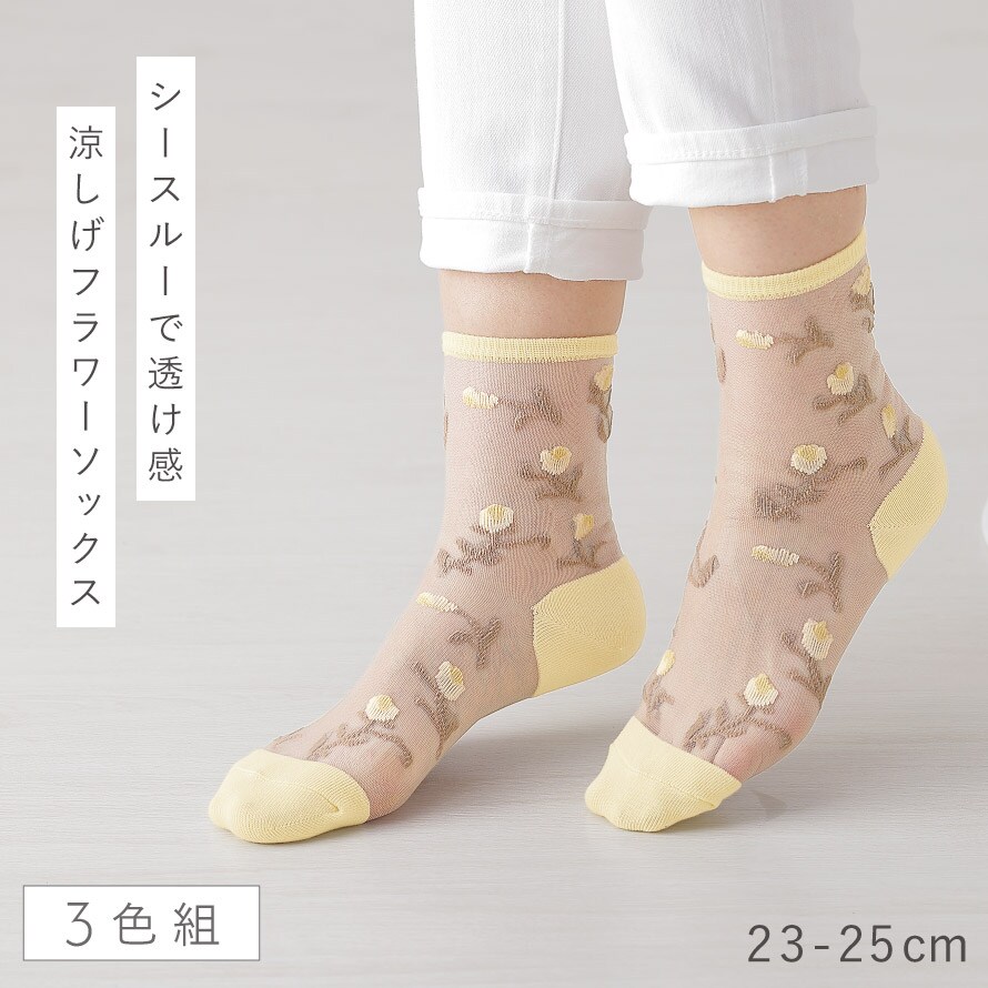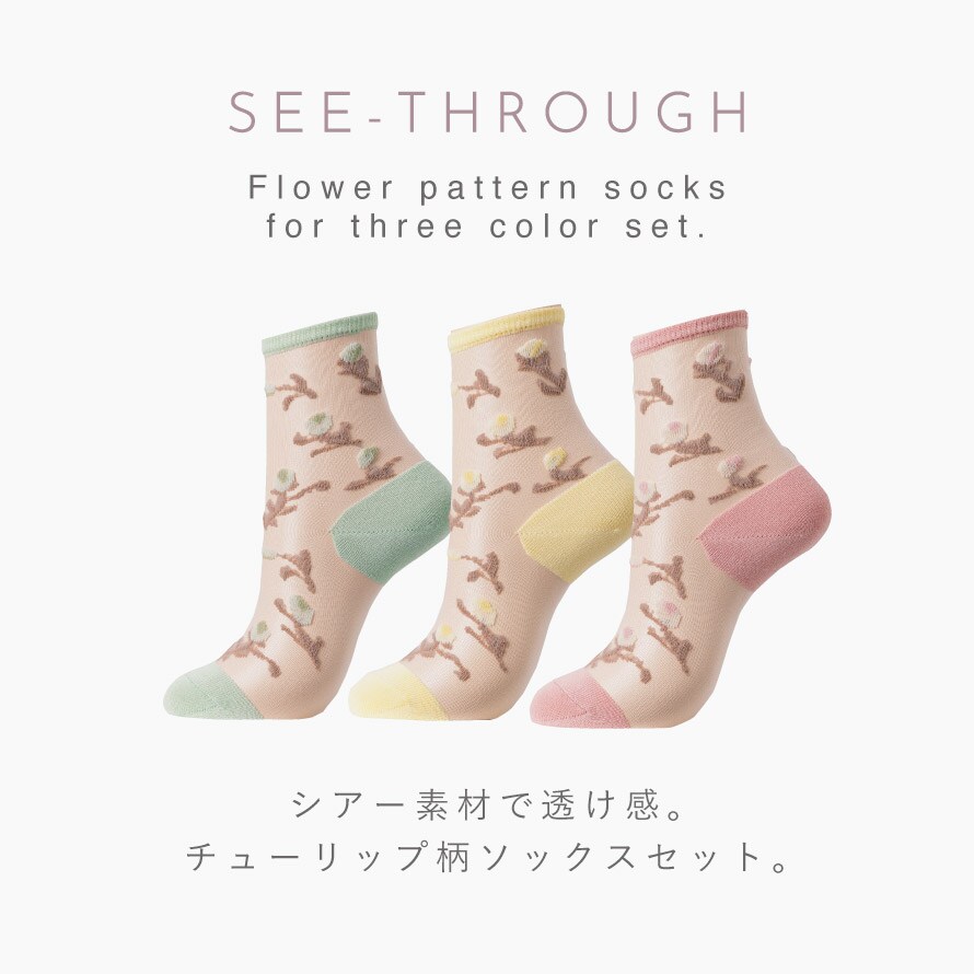 シースルーソックス レディース 靴下 シースルー靴下 花柄 夏用 3色組 23-25cm 春夏 薄手 涼しい 日本製 シースルーチューリップ柄ソックス