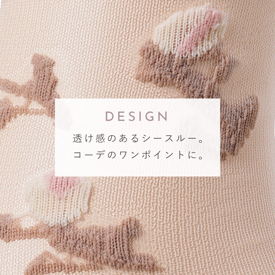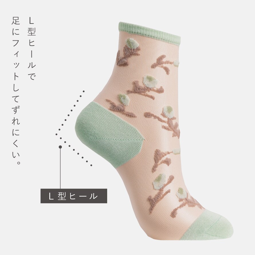 足底+レッグ部は透け感のあるシースルー。サンダルやスニーカーとの相性もよく、足元をキュートに見せてくれます。チューリップ柄が可愛らしく夏コーデのワンポイントにもなり◎。