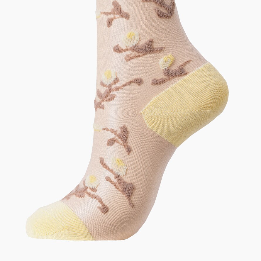 シースルーで足元に透け感、人気のシアー素材のフラワー柄ソックス。