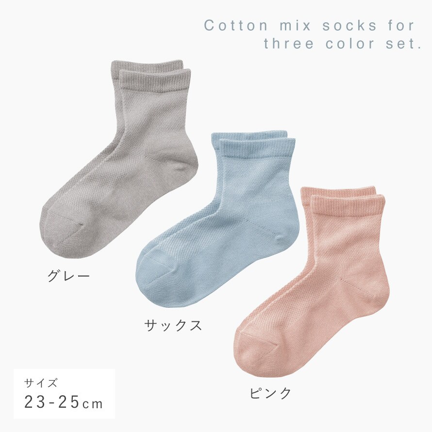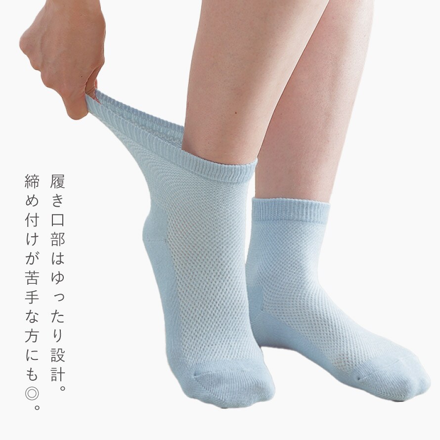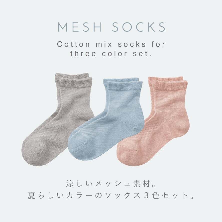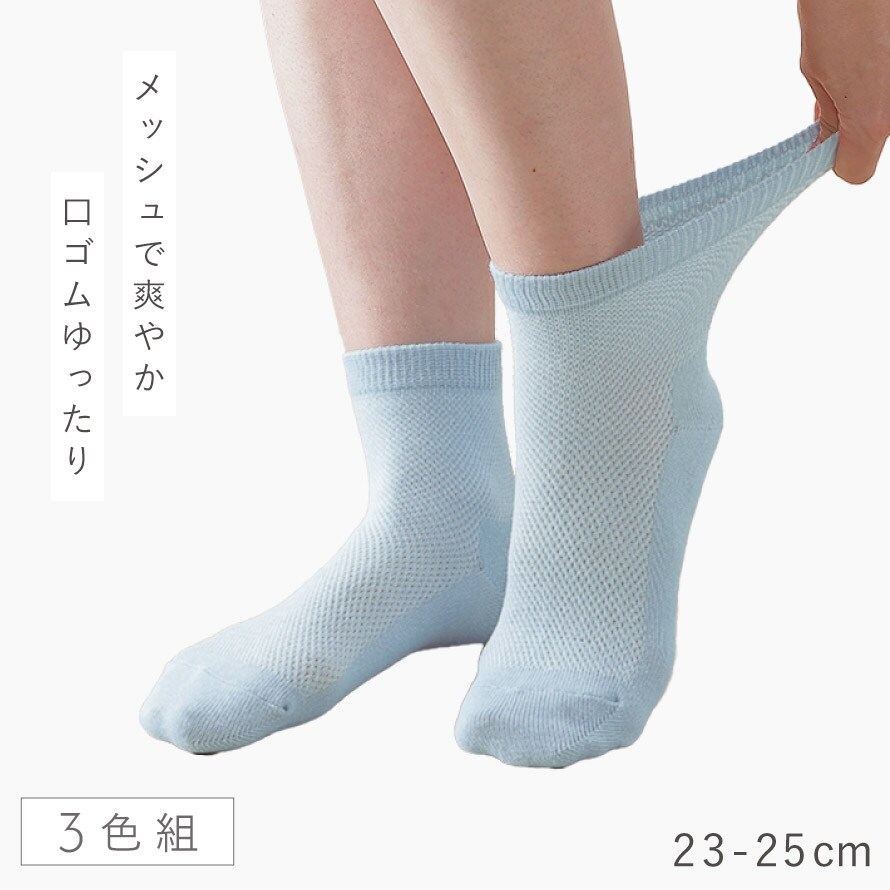 メッシュで爽やかな履き心地。口ゴムゆったりで締め付けにくいソックス3色セット。
