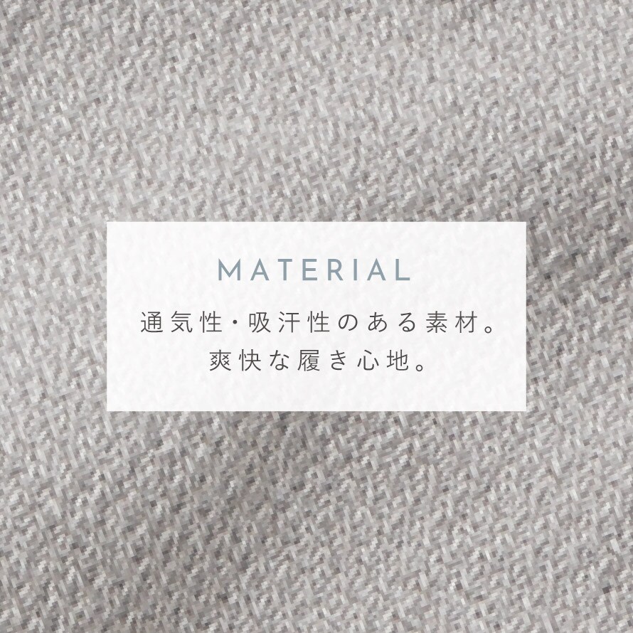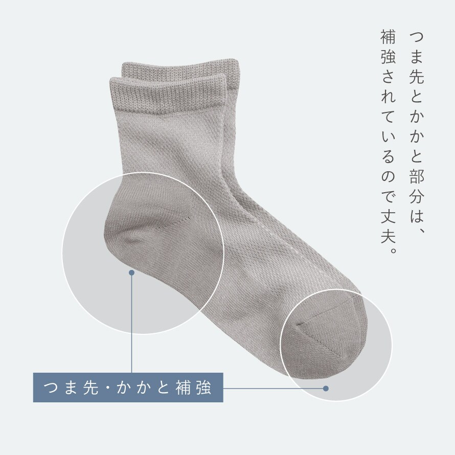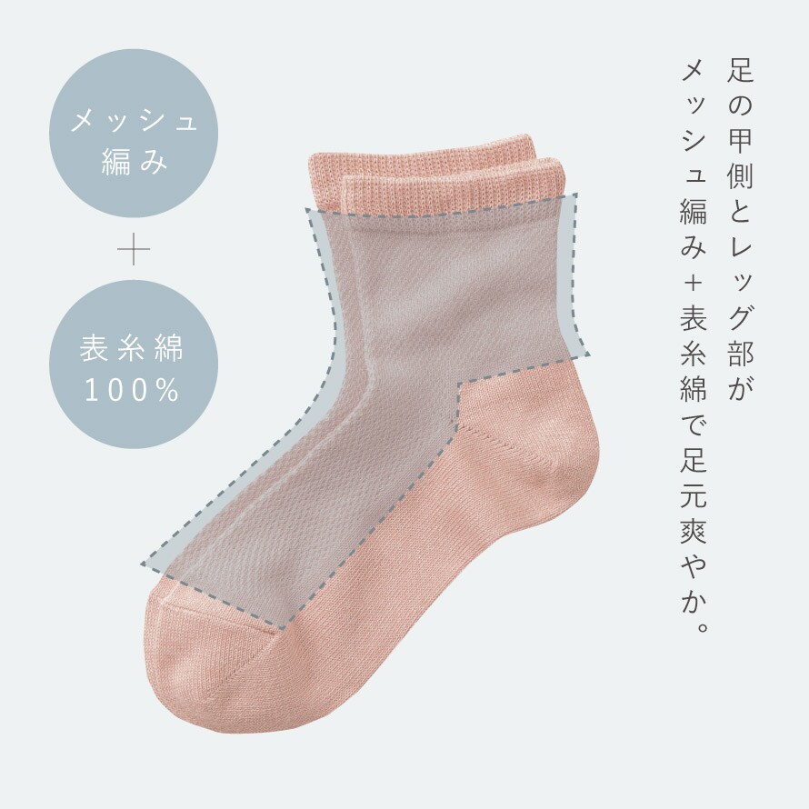 足の甲側とレッグ部がメッシュ編み+表糸綿100%なので、通気性・吸汗性のある爽やかな履き心地。