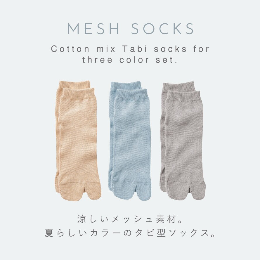 メッシュで爽やかな履き心地。ムレにくく快適なタビ型ソックス3色セット。