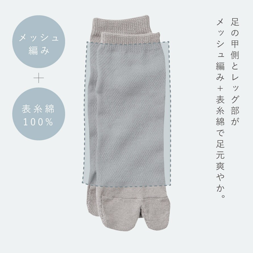 足の甲側とレッグ部がメッシュ編み+表糸綿100%なので、通気性・吸汗性のある爽やかな履き心地。