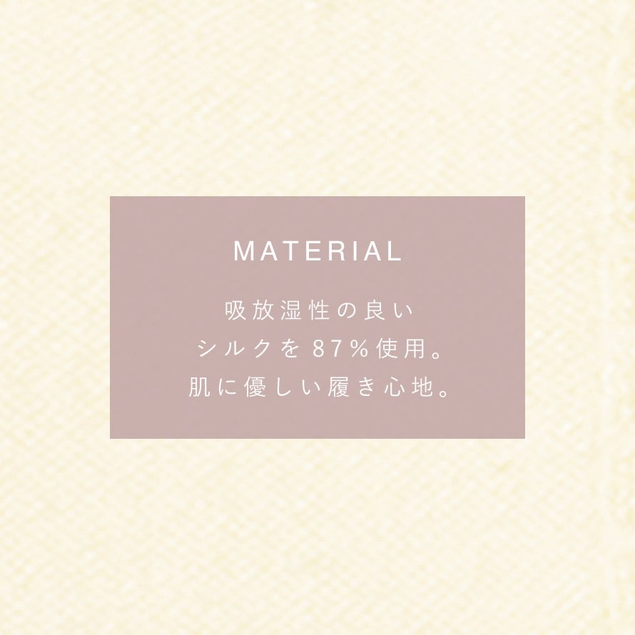 お肌に優しく吸放湿性の良いシルクを87%使用。肌あたりよく気持ちのよい履き心地です。
