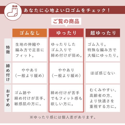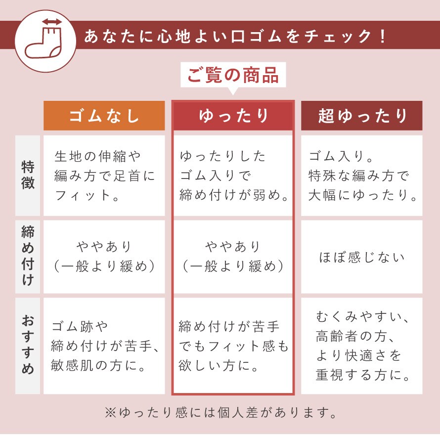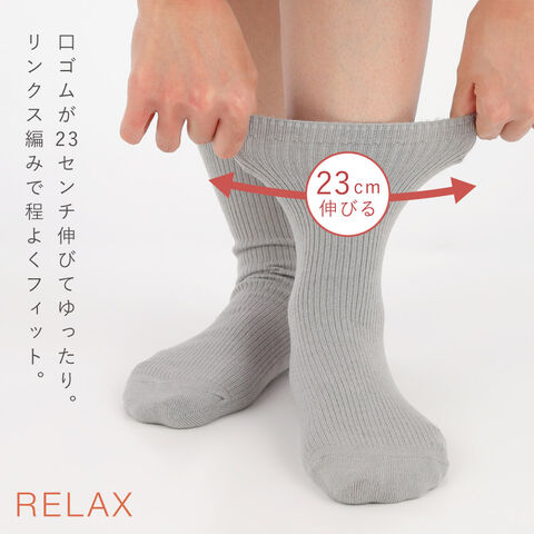 履き口部はゆったり設計。口ゴム伸び寸は約23cmです。むくみにもやさしく、締め付けが苦手な方にもおすすめ。