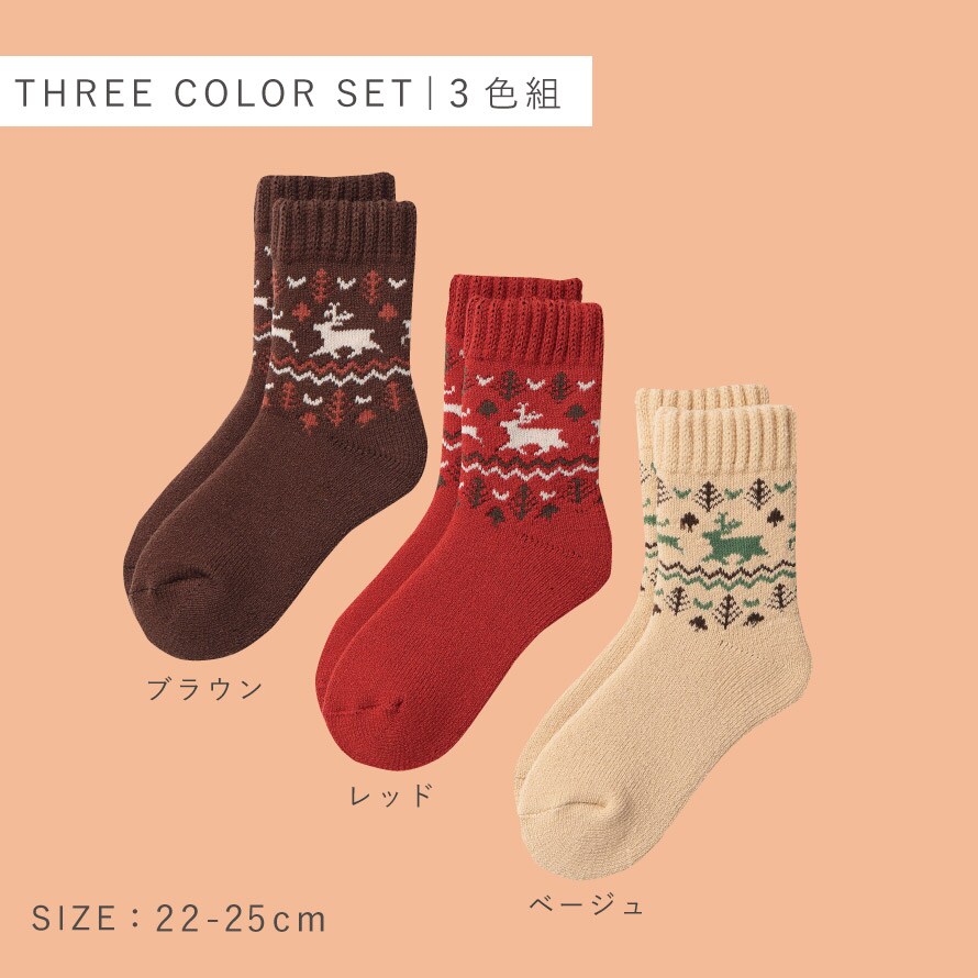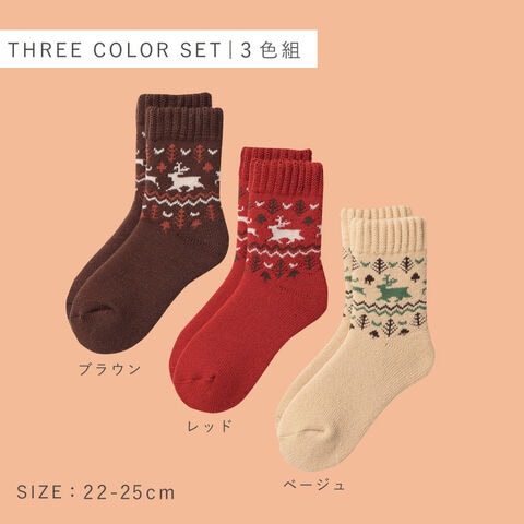 シカ柄をあしらった冬らしいデザインと配色が可愛らしい印象。寒い地域にお住まいの方にもご納得いただける、非常に暖かい靴下3色セット。
