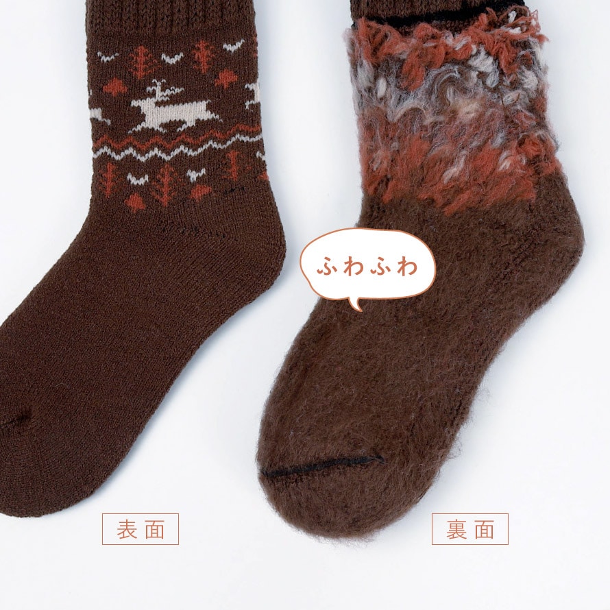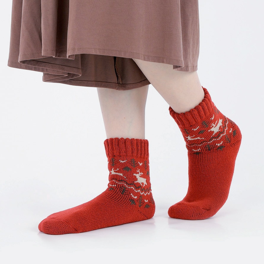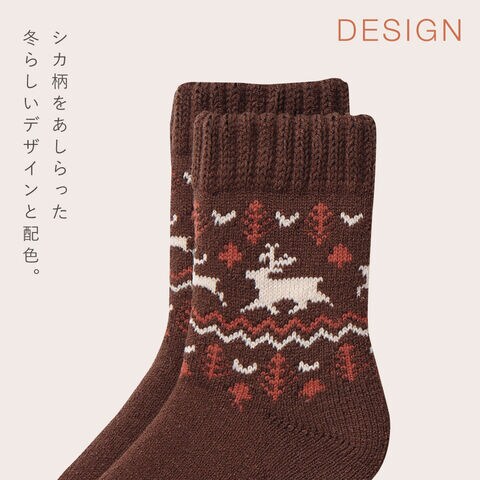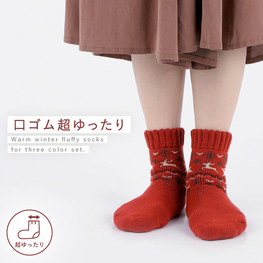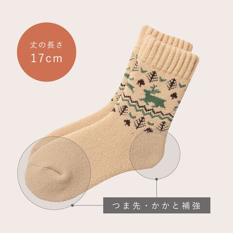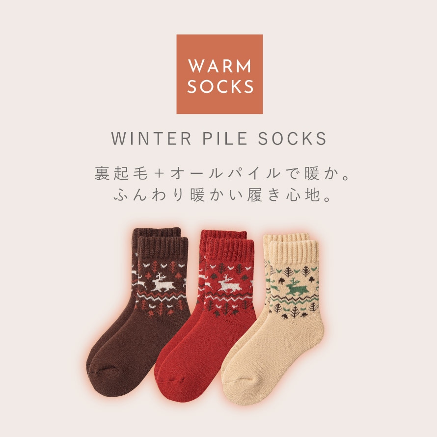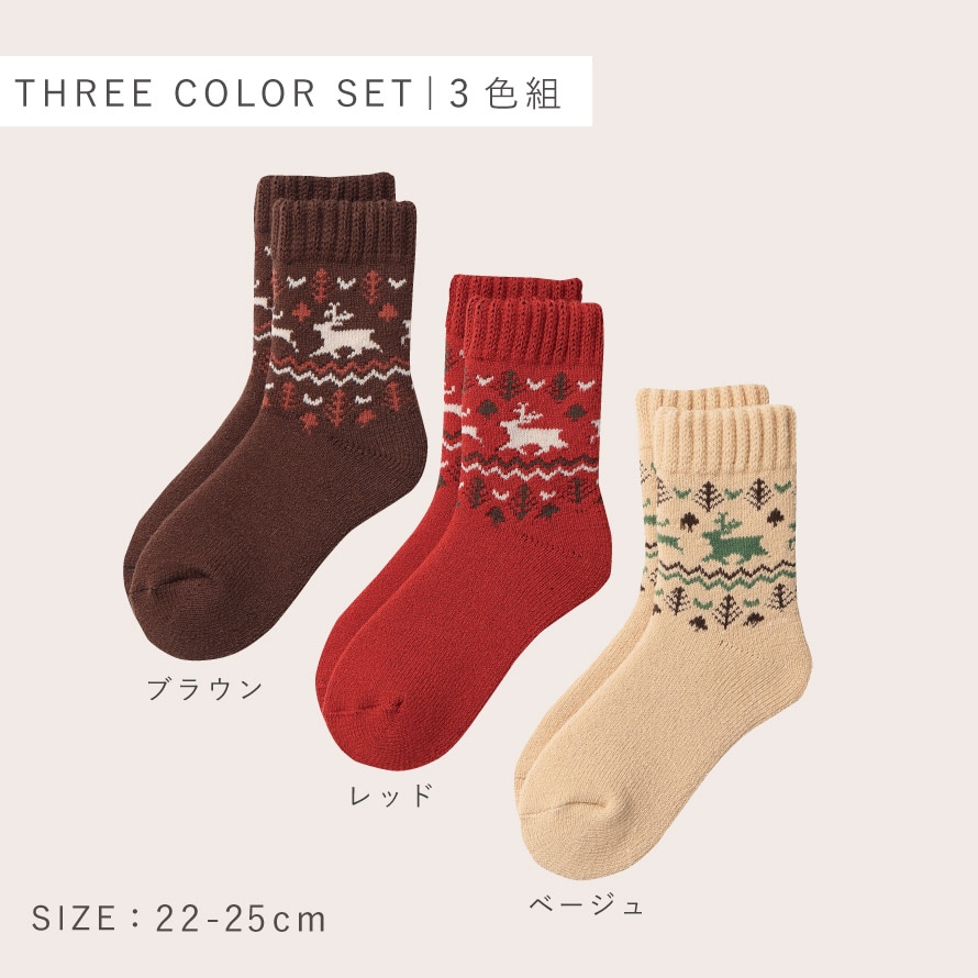シカ柄をあしらった冬らしいデザインと配色が可愛らしい印象。寒い地域にお住まいの方にもご納得いただける、非常に暖かい靴下3色セット。