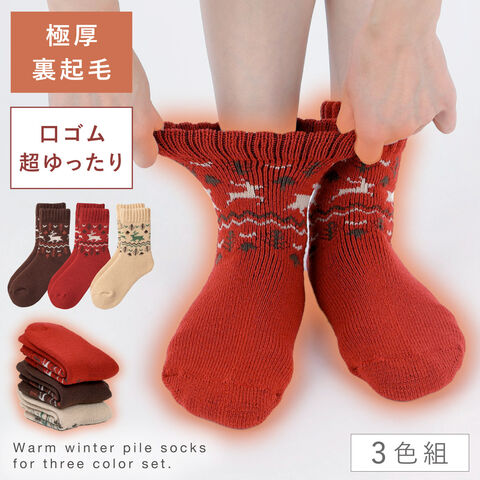 ノルディック柄 靴下 レディース 暖かい 冬 22-25cm 3色組 裏起毛 履き口 ゆったり 締め付けない シニア 高齢者 秋冬 裏起毛パイルびよ~んシカ柄ソックス