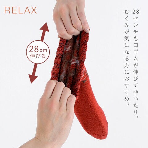 履き口部(口ゴム)が約28cm伸びる超ゆったり設計。足首ゆったりのタイプの靴下の中でも、かなりゆったりしたタイプになります。足首をしめつけず、むくみが気になる方にもおすすめです。