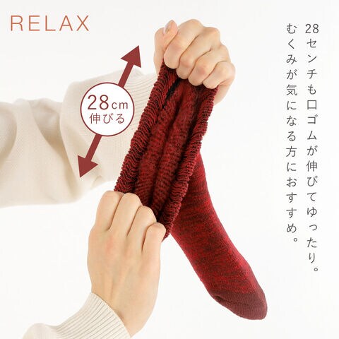 履き口部(口ゴム)が約28cm伸びる超ゆったり設計。足首ゆったりのタイプの靴下の中でも、かなりゆったりしたタイプになります。足首をしめつけず、むくみが気になる方にもおすすめです。