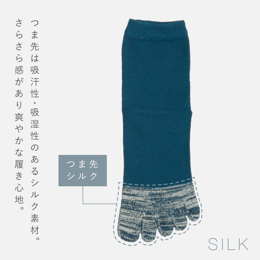 つま先は吸汗性・吸湿性のあるシルク素材。さらさら感があり爽やかな履き心地。
