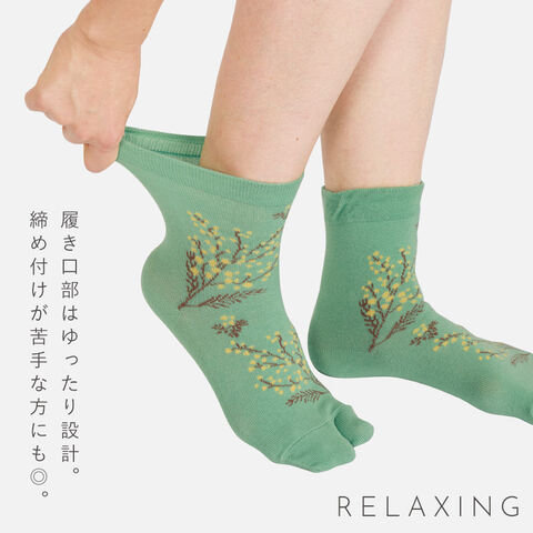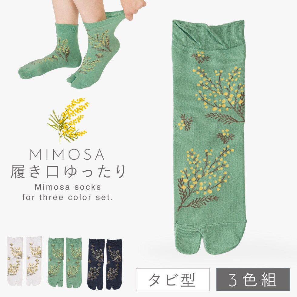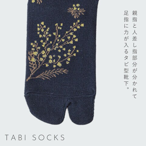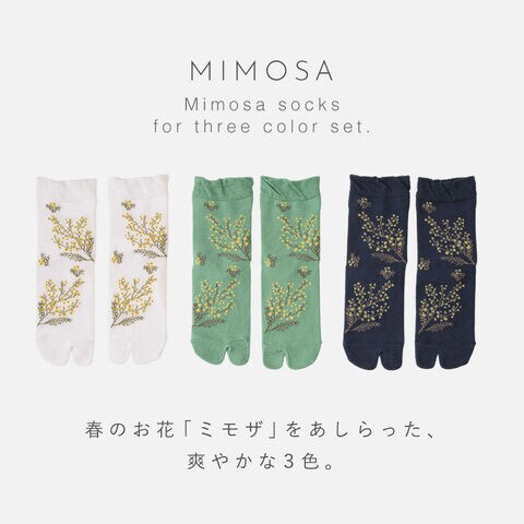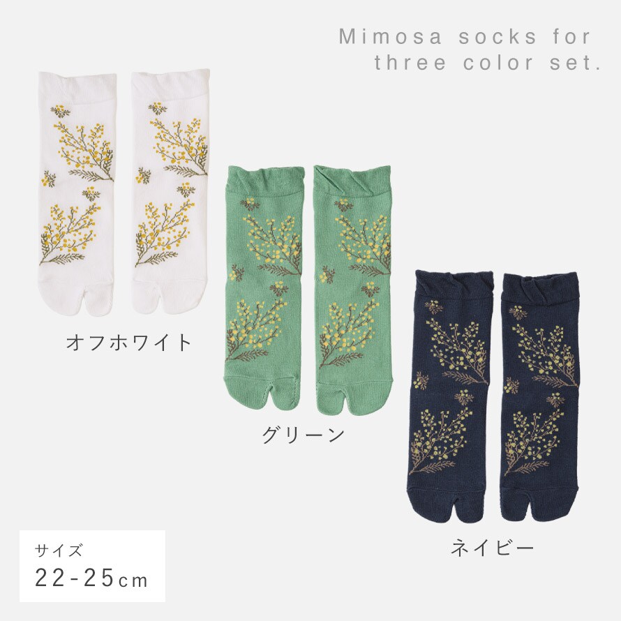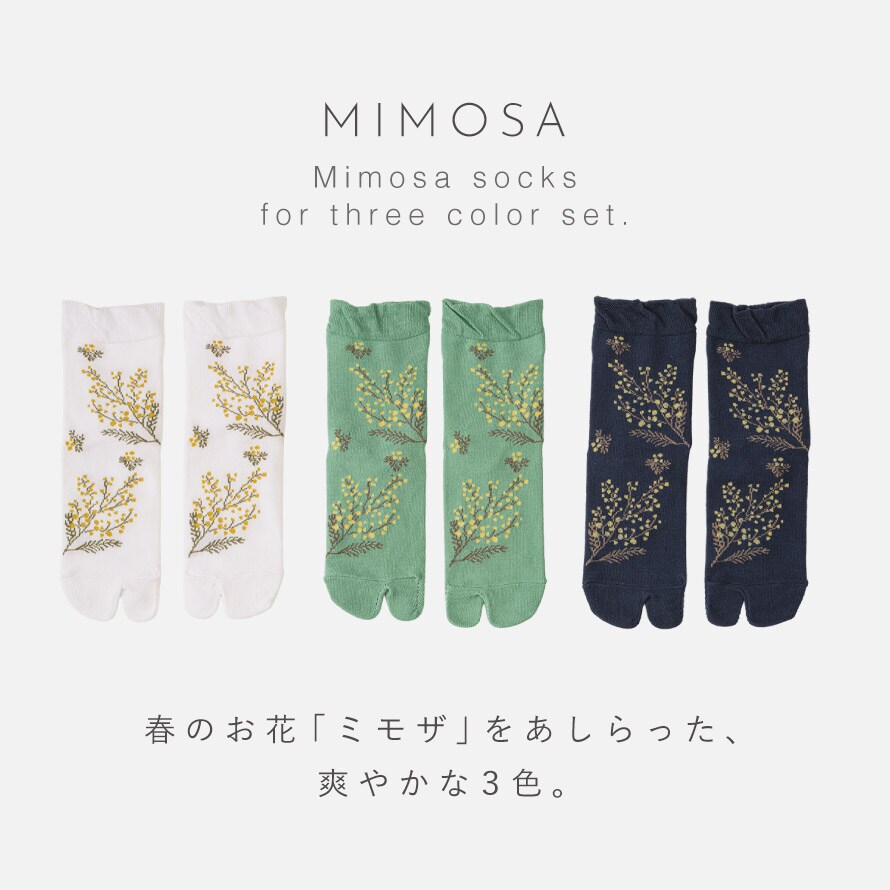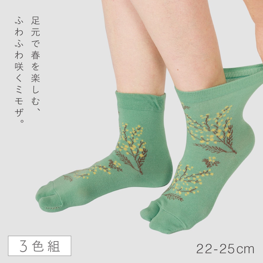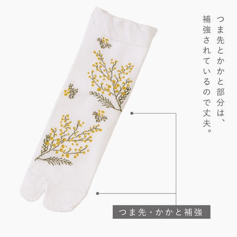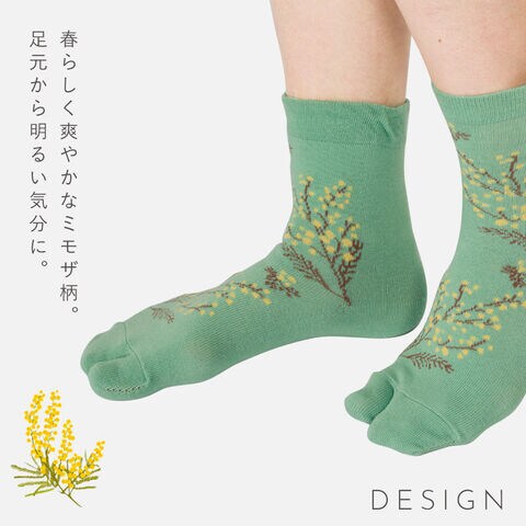 春らしく爽やかなミモザ柄。ムレにくいタビ型ソックス。