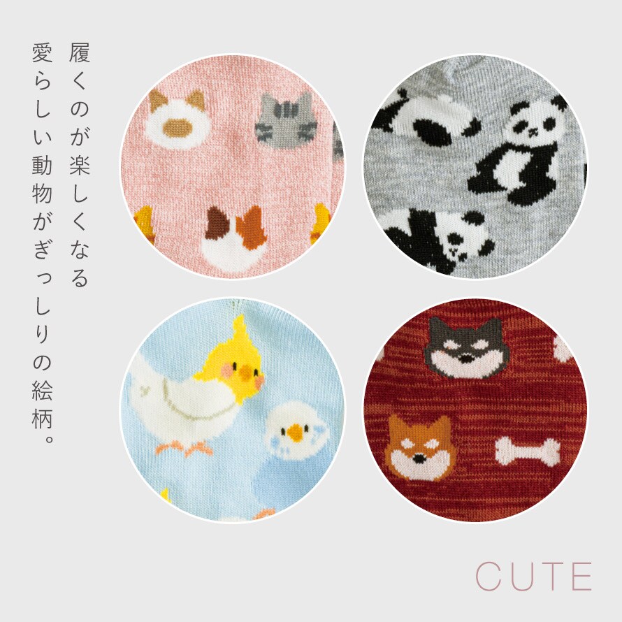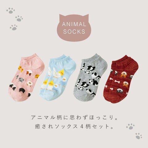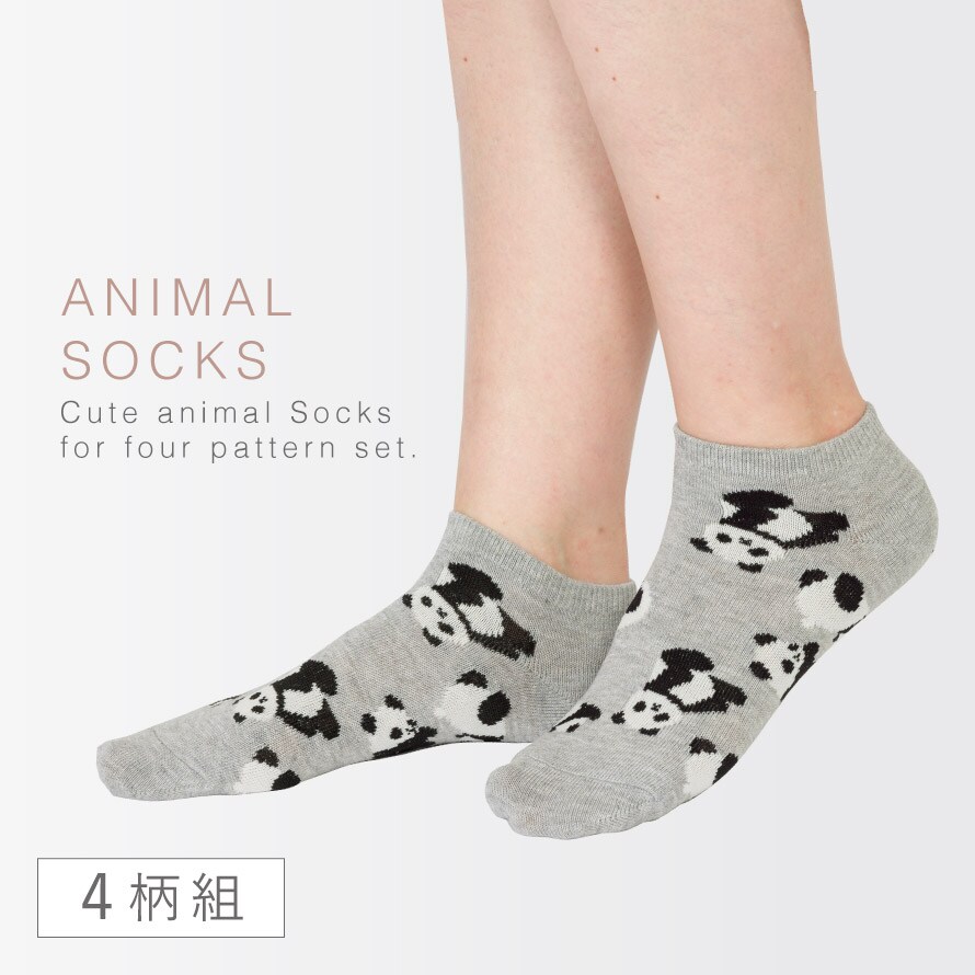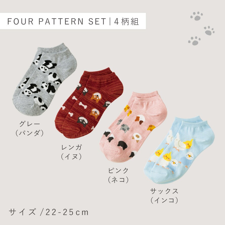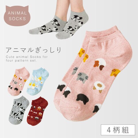 靴下 動物 レディース スニーカー アニマル ソックス 4柄組 22-25cm 猫 犬 パンダ インコ スニーカーソックス くるぶしソックス まとめ買い 4足 ぎっしりアニマルスニーカー丈ソックス