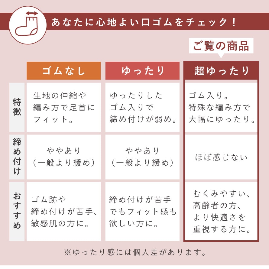 履き口部(口ゴム)が約36cm伸びる超ゆったり設計。口ゴムゆったりのタイプの靴下の中でも、かなりゆったりしたタイプになります。足をしめつけず、むくみが気になる方にもおすすめです。
