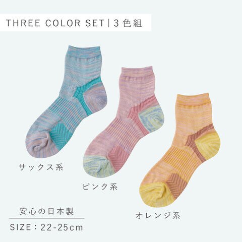 色鮮やかなミックスカラーが足元を元気にしてくれる。ピンク系、サックス系、オレンジ系の3色セットです。洗い替えにも便利です。