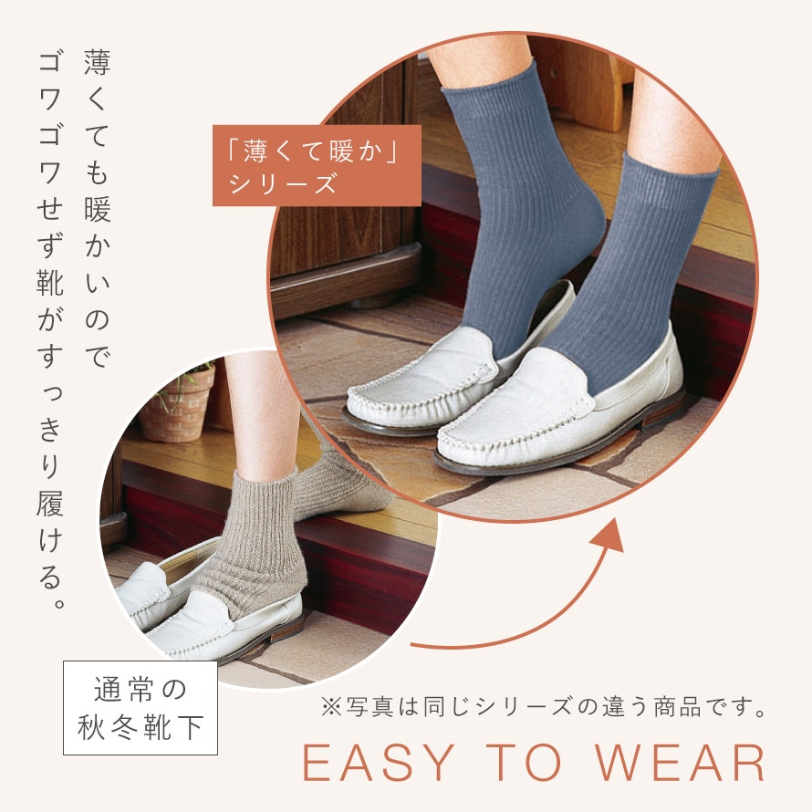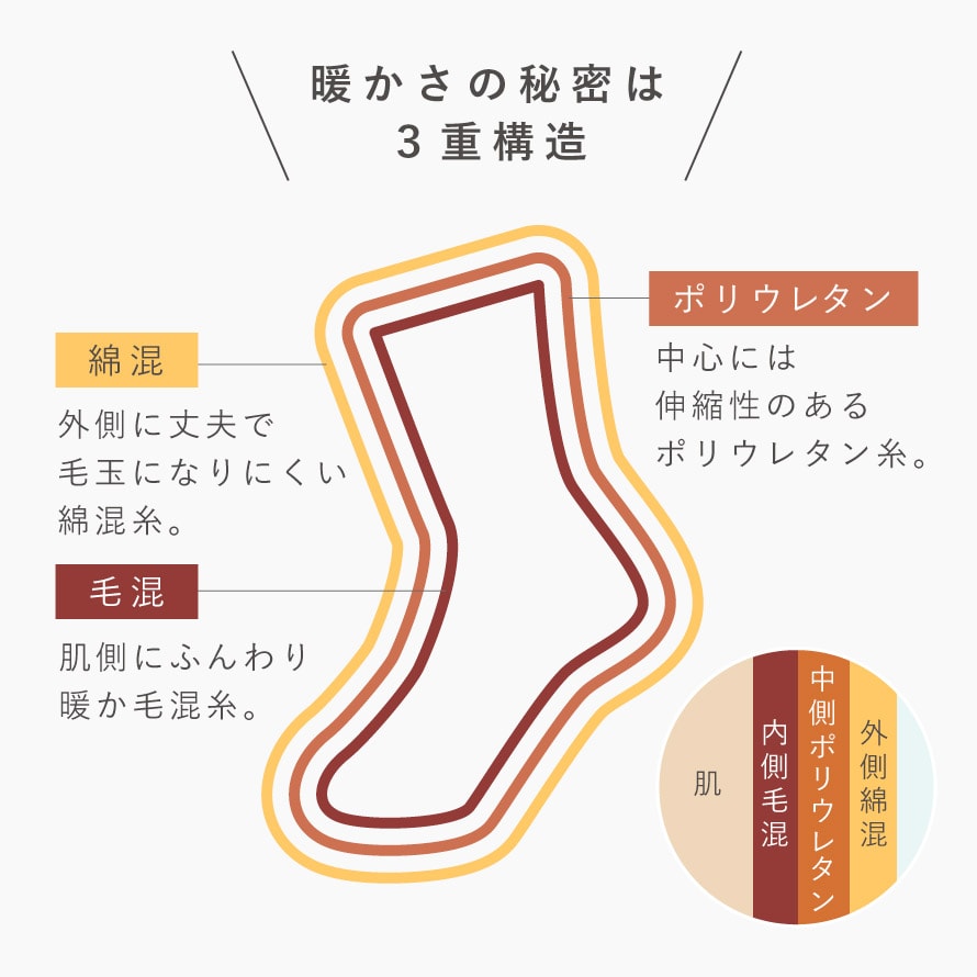 肌側に毛混糸、外側に丈夫で毛玉になりにくい綿混糸、中心には伸縮性のあるポリウレタン糸を使用薄くて暖かい靴下です。
