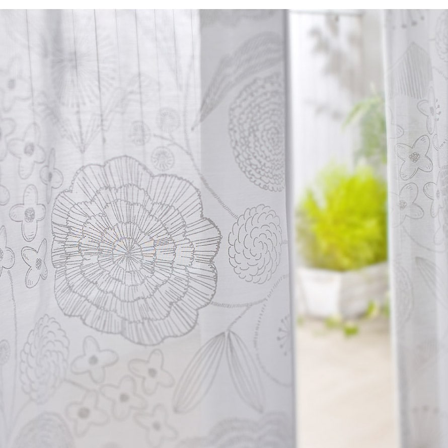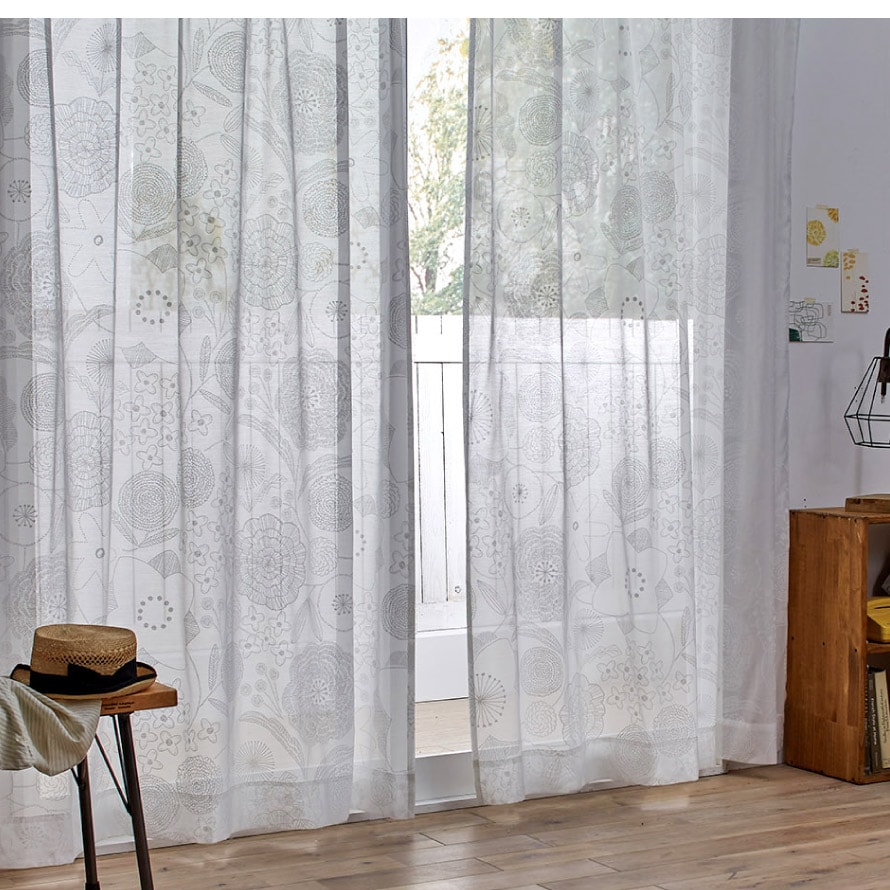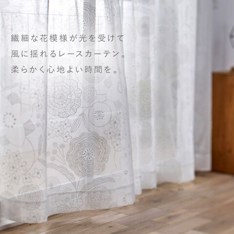 繊細な手書きの花々を一面にデザインした、北欧テイストのレースカーテン。インテリアに馴染む洗練されたデザイン。