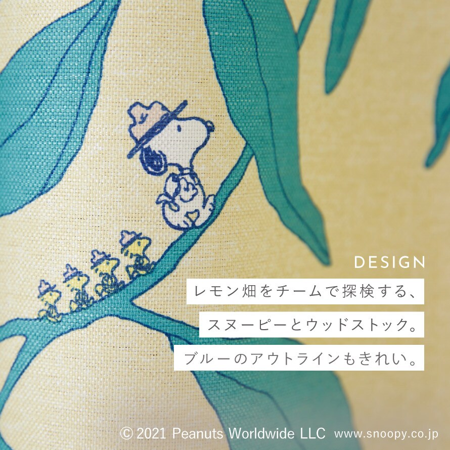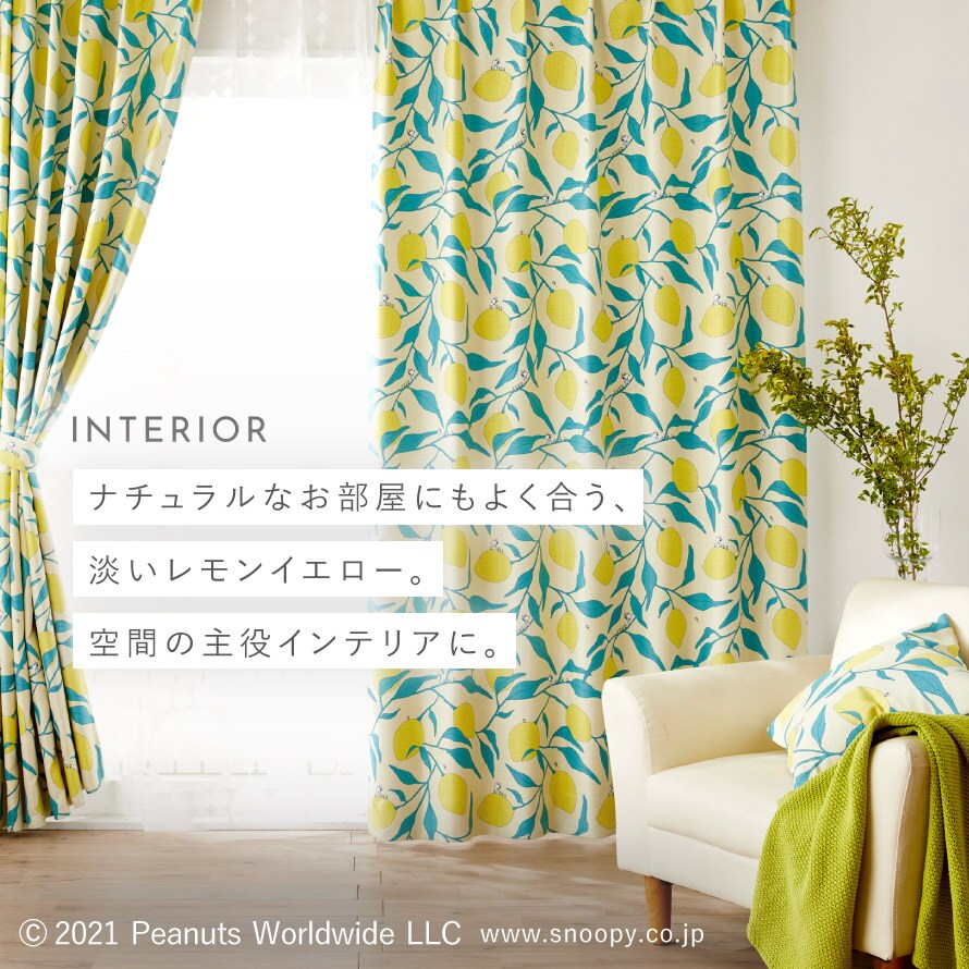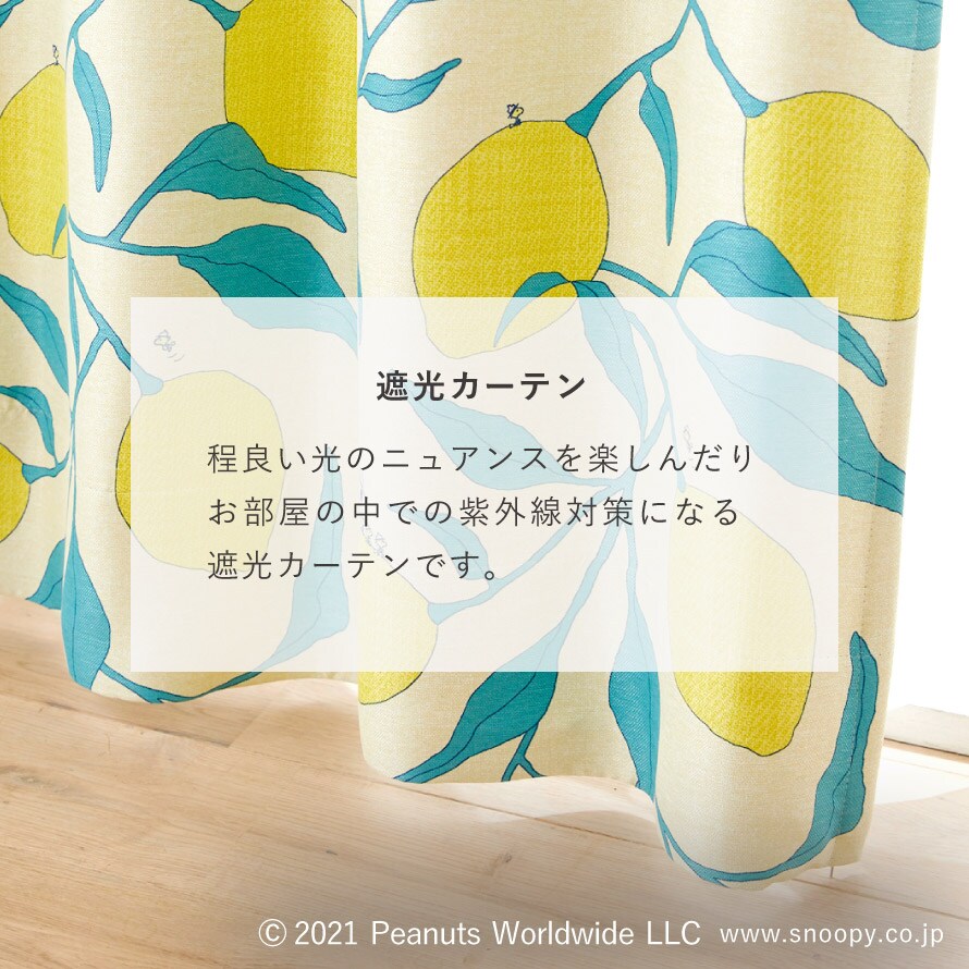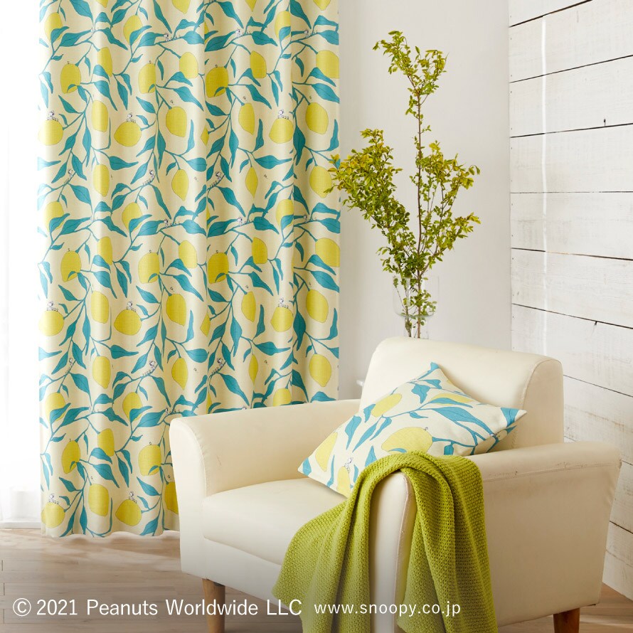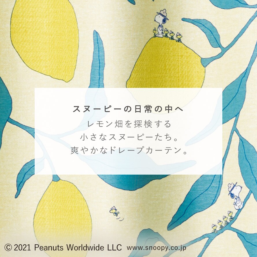 レモン畑を探検するスヌーピーたちが可愛いドレープカーテン。レモンのイエローが爽やかで、ナチュラルなインテリアにもよく合います。