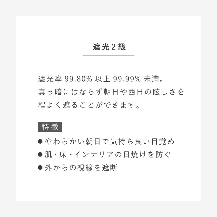 遮光2級(遮光率99.80%以上99.99%未満)で真っ暗にはならず、朝日や西日のまぶしさを程よく遮ることができます。朝日をやんわりと浴びて、自然な光に。肌やフローリング、家具の日焼け、外からの気になる視線を遮断します。