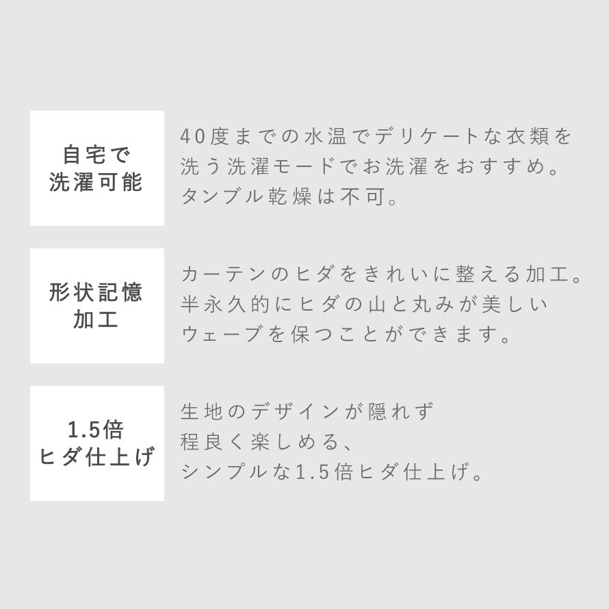 形状記憶加工で、カーテンのヒダをきれいに整えます。半永久的にヒダの山と丸みが美しいウェーブを保つことができます。