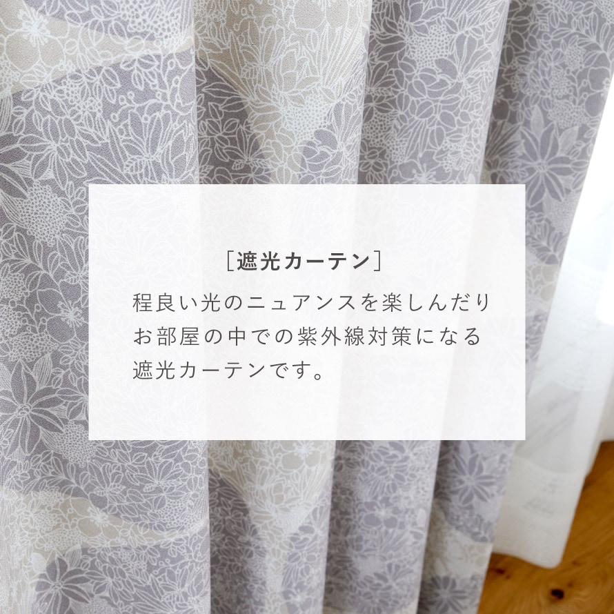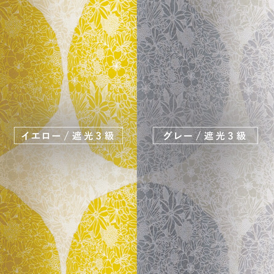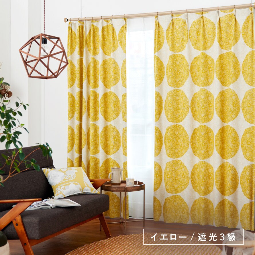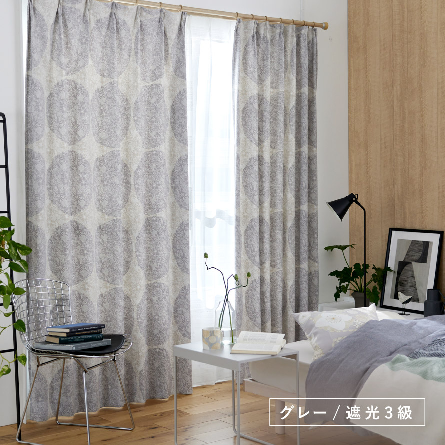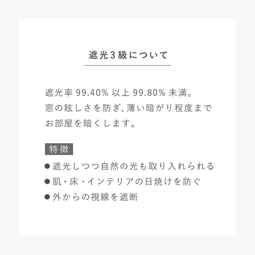 遮光3級(遮光率99.40%以上99.80%未満)で、窓のまぶしさを防ぎ、閉めると薄い暗がり程度までお部屋を暗くします。遮光カーテンとしては効果が低いですが、外からの光を入れ、デザイン重視のカーテンでお部屋のインテリアを楽しみたい方におすすめです。