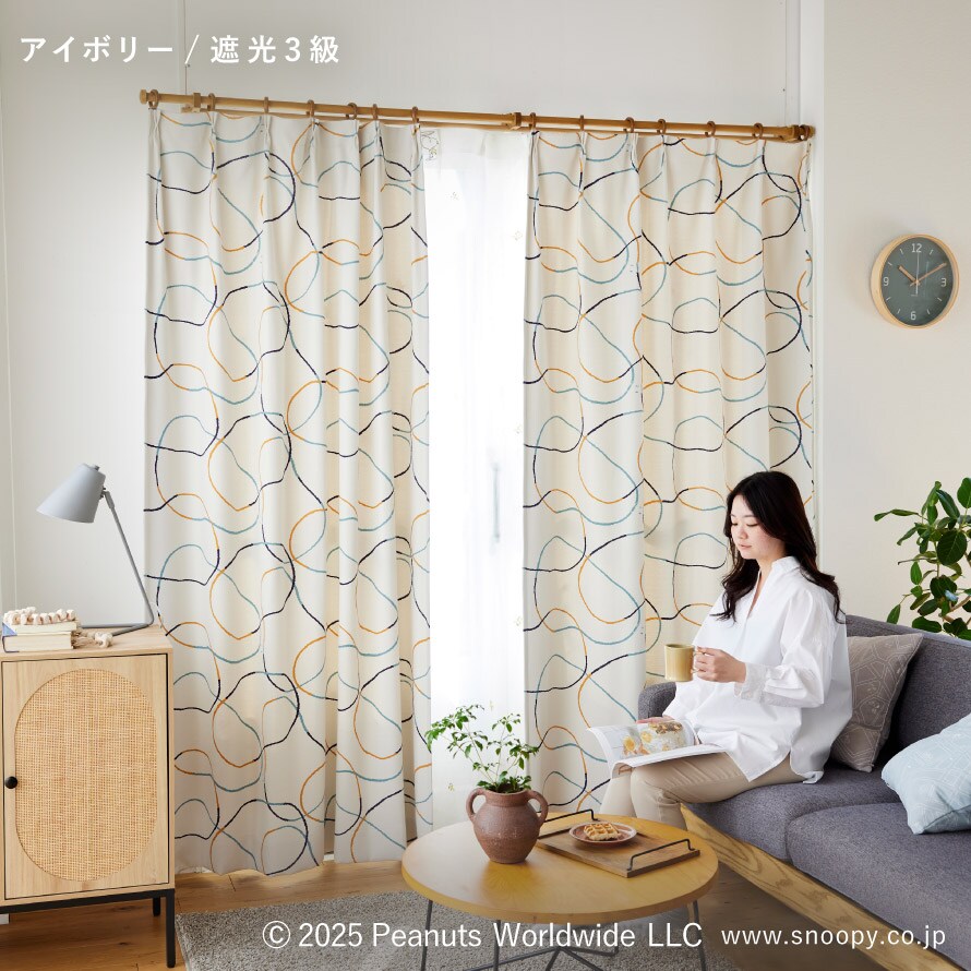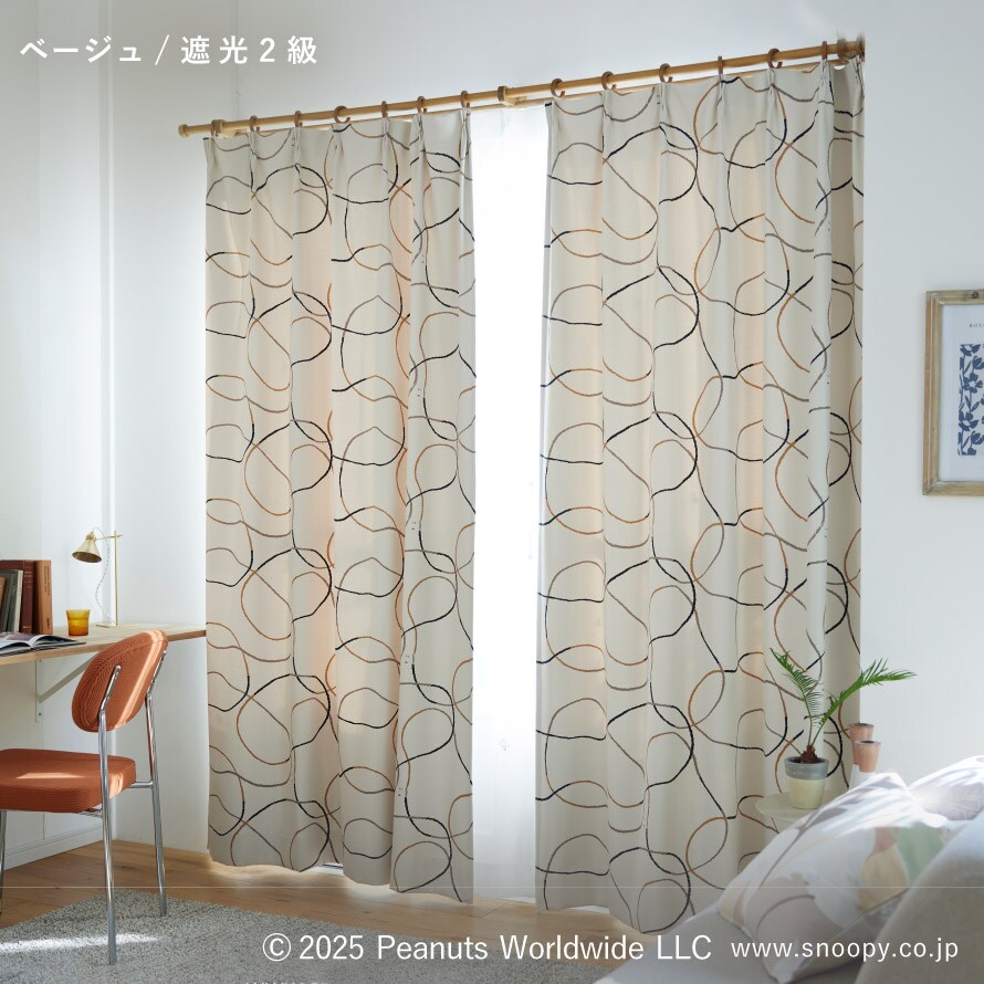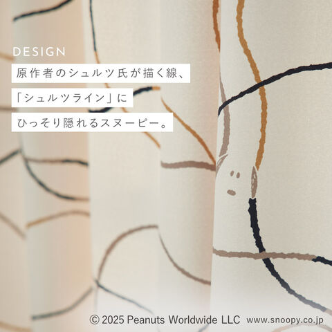 パターンの中にスヌーピーが隠れた大人デザインのカーテン。原作者のシュルツ氏が描く線、シュルツタッチに着目したラインデザイン。