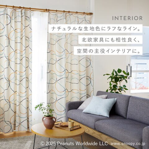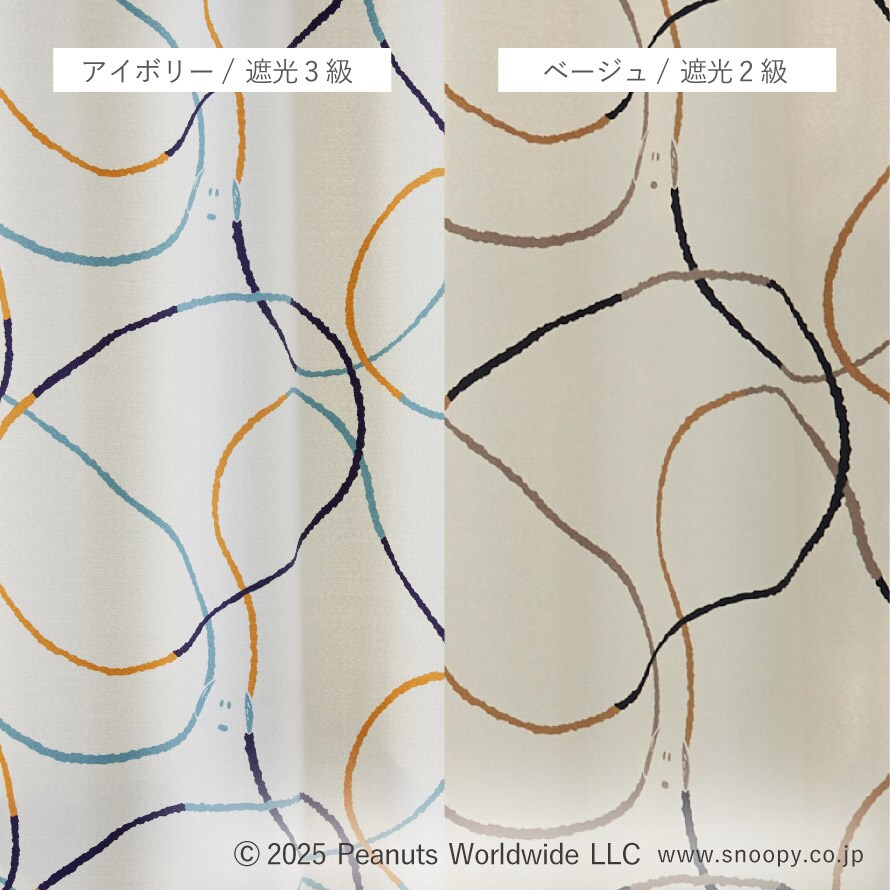 パターンの中にスヌーピーが隠れた大人デザインのカーテン。原作者のシュルツ氏が描く線、シュルツタッチに着目したラインデザイン。