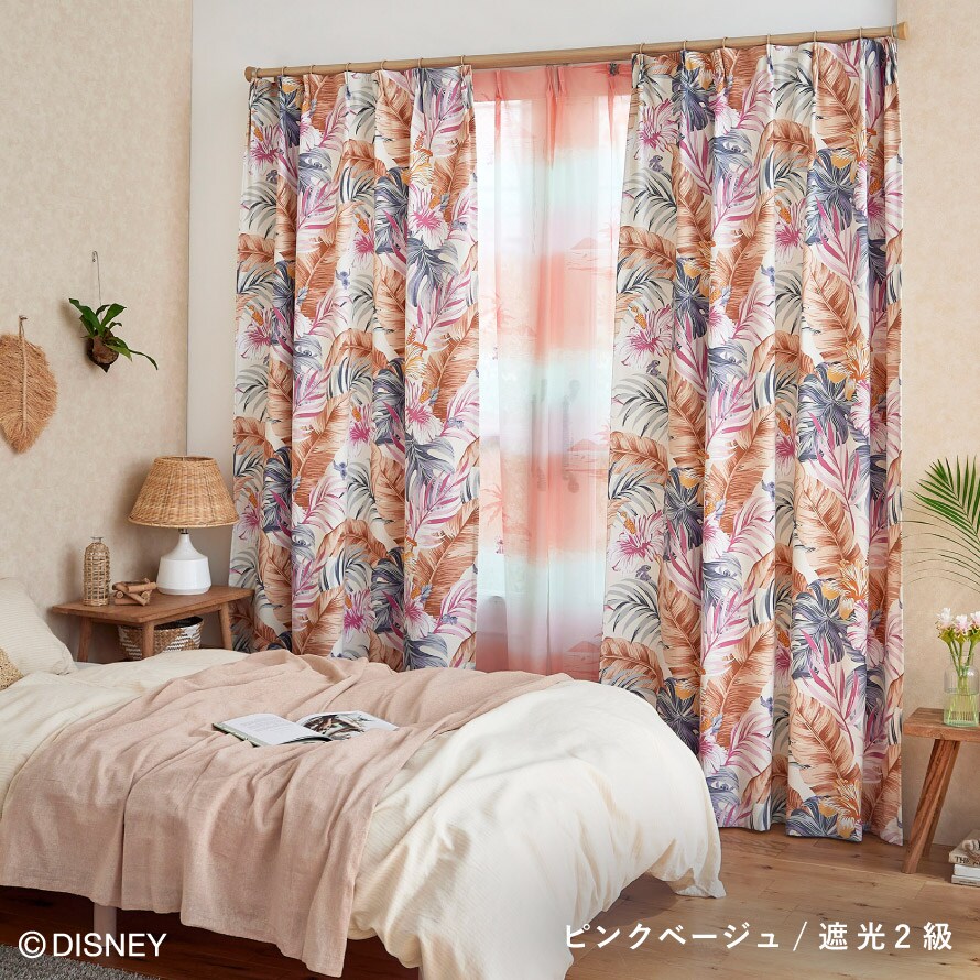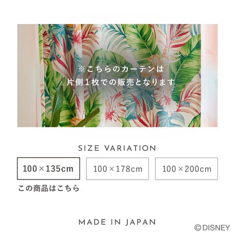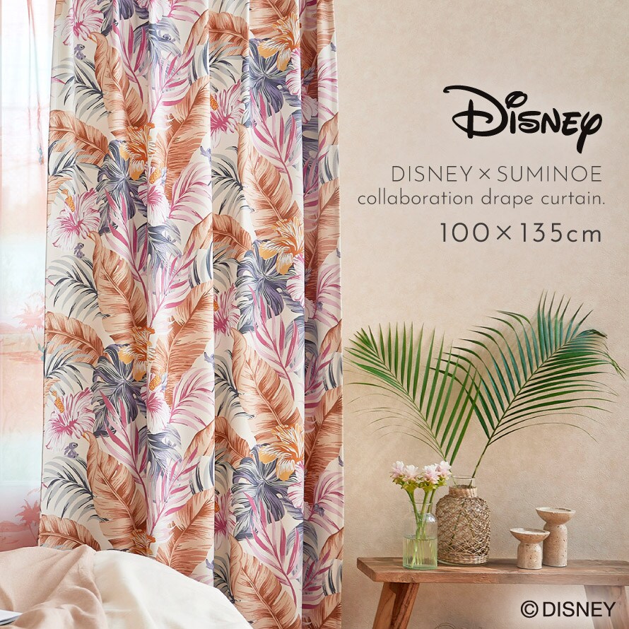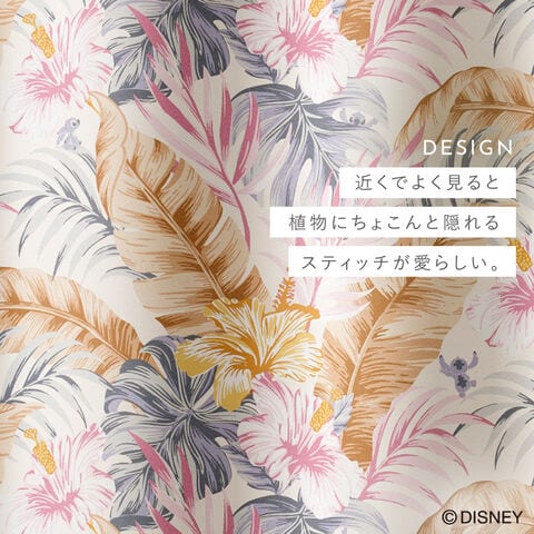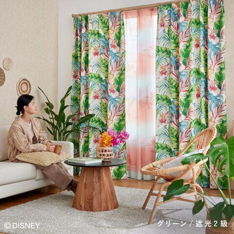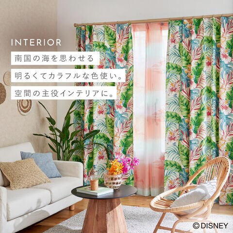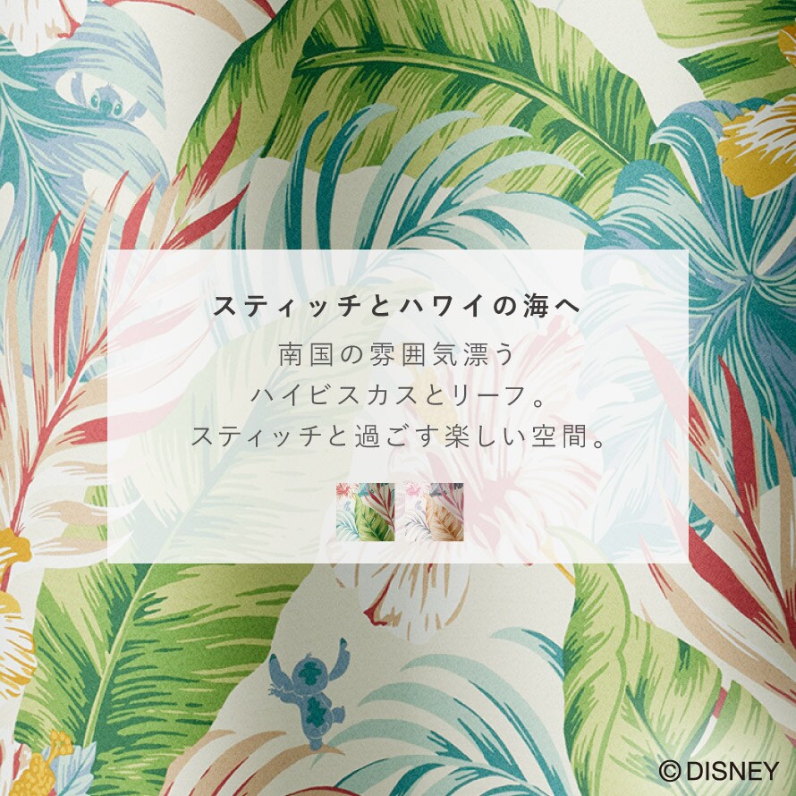 南国の雰囲気漂うハイビスカスとリーフに、ちょこんと隠れるスティッチが愛らしいドレープカーテン。