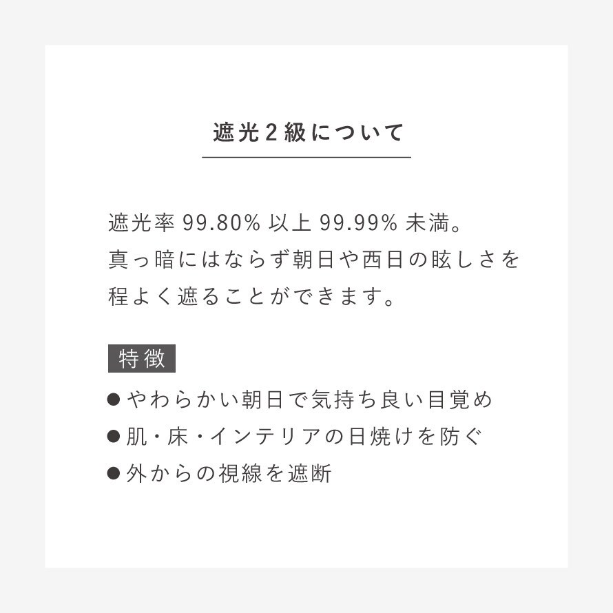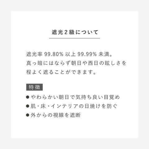遮光2級(遮光率99.80%以上99.99%未満)で真っ暗にはならず、朝日や西日のまぶしさを程よく遮ることができます。朝日をやんわりと浴びて、自然な光に。肌やフローリング、家具の日焼け、外からの気になる視線を遮断します。