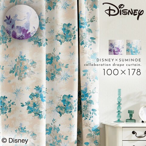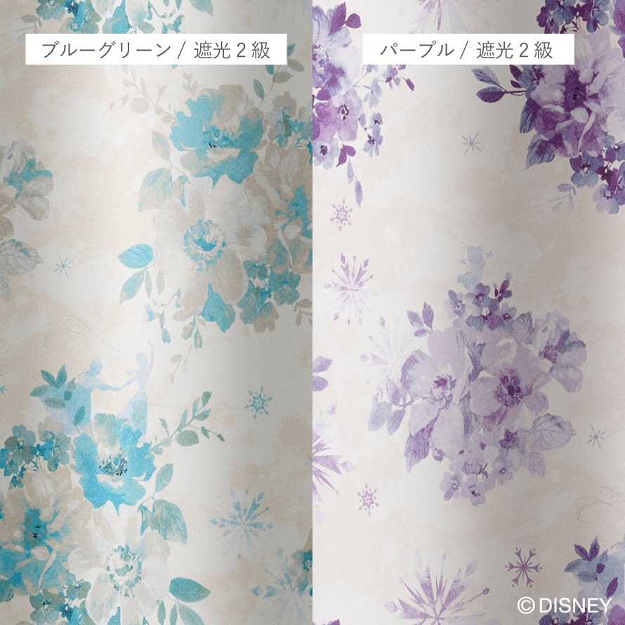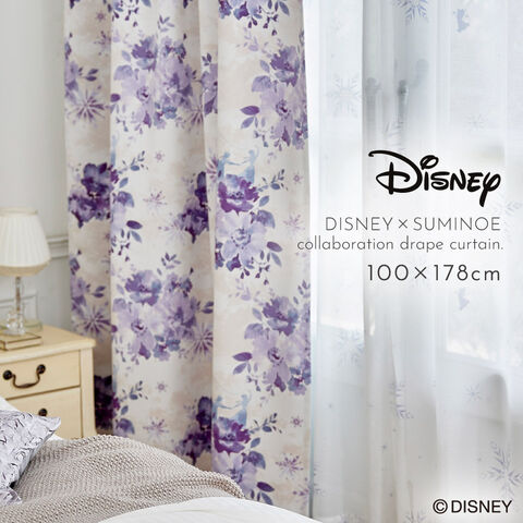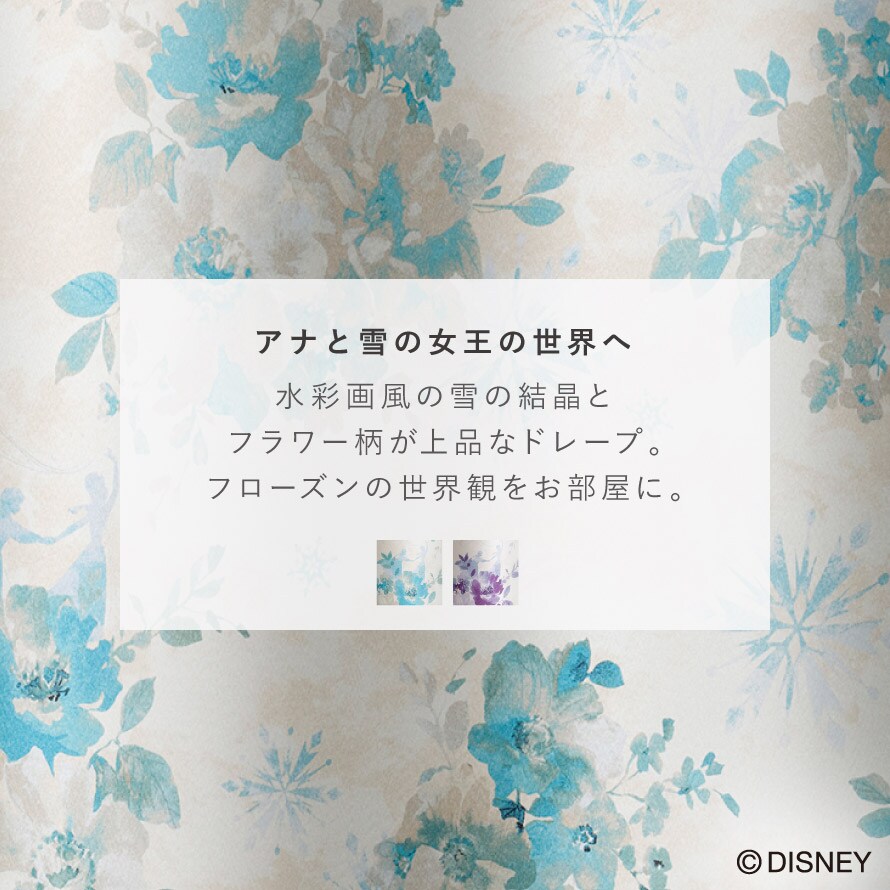 水彩画風の雪の結晶とフラワー柄が上品なドレープカーテン。絵柄に溶け込んだアナやエルサ、オラフのシルエットが心をくすぐります。
