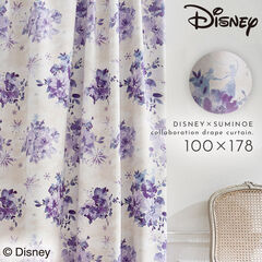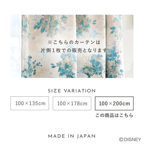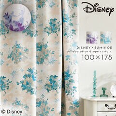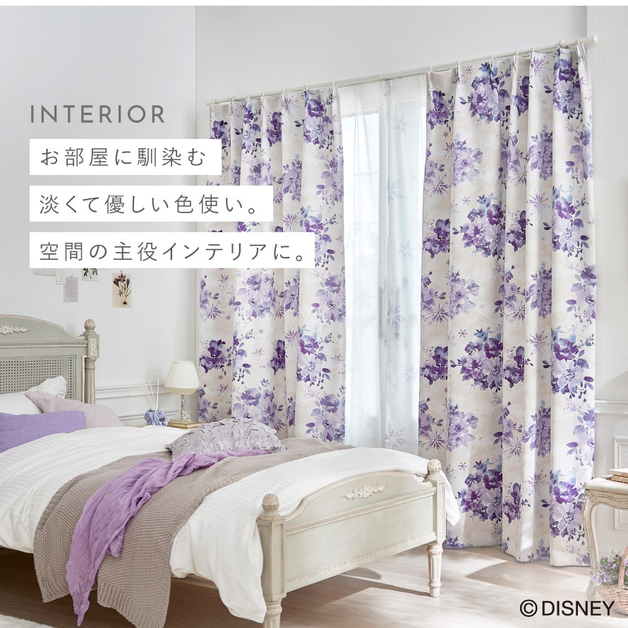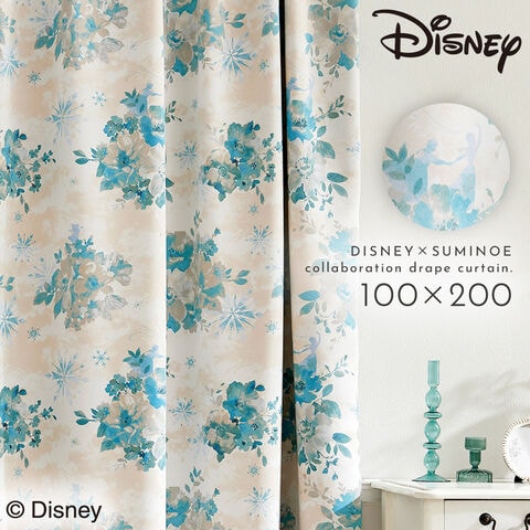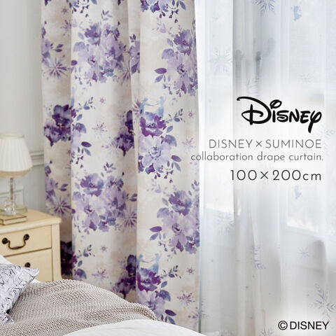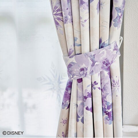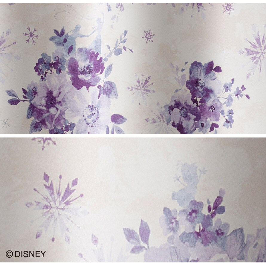 水彩画風の雪の結晶とフラワー柄が上品なドレープカーテン。絵柄に溶け込んだアナやエルサ、オラフのシルエットが心をくすぐります。