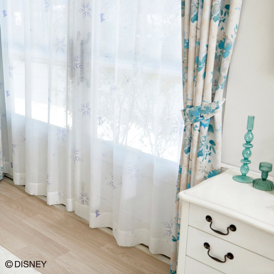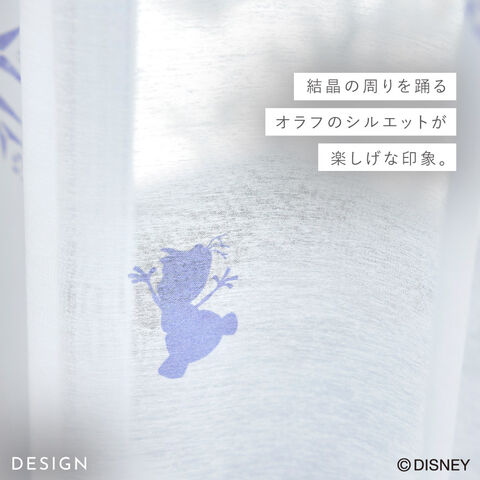雪の結晶が舞い降りる上品なボイル。結晶の周りを踊るオラフのシルエットが楽しげな印象のレースカーテンです。