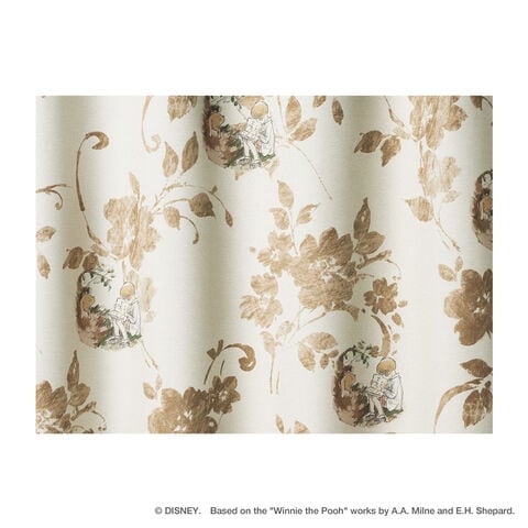 水彩画タッチの植物とプーさんたちが大人可愛いドレープカーテン。挿絵のようなイラストが上品で、インテリアにも馴染むデザインです。