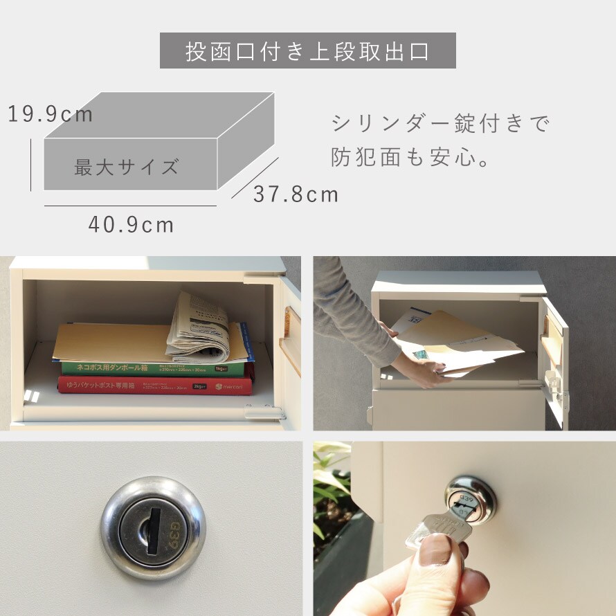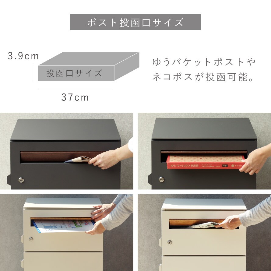 上段収納の投函口サイズは幅37×高さ3.9cmと大きなサイズ設計で、大きめの郵便物も投函可能です。