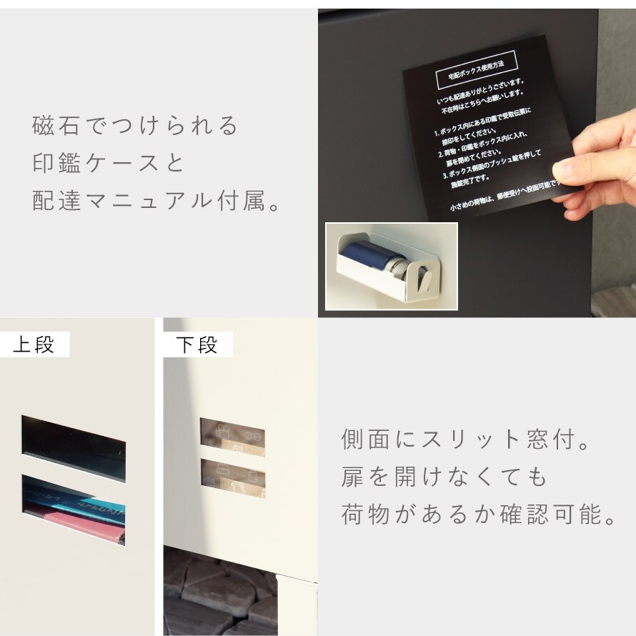 キーフック付き印鑑ケースと宅配業者用のマニュアルが付属しており(マグネット付きでお好きな場所に貼り付け可)、宅配ボックスとして、すぐにご使用いただけます。